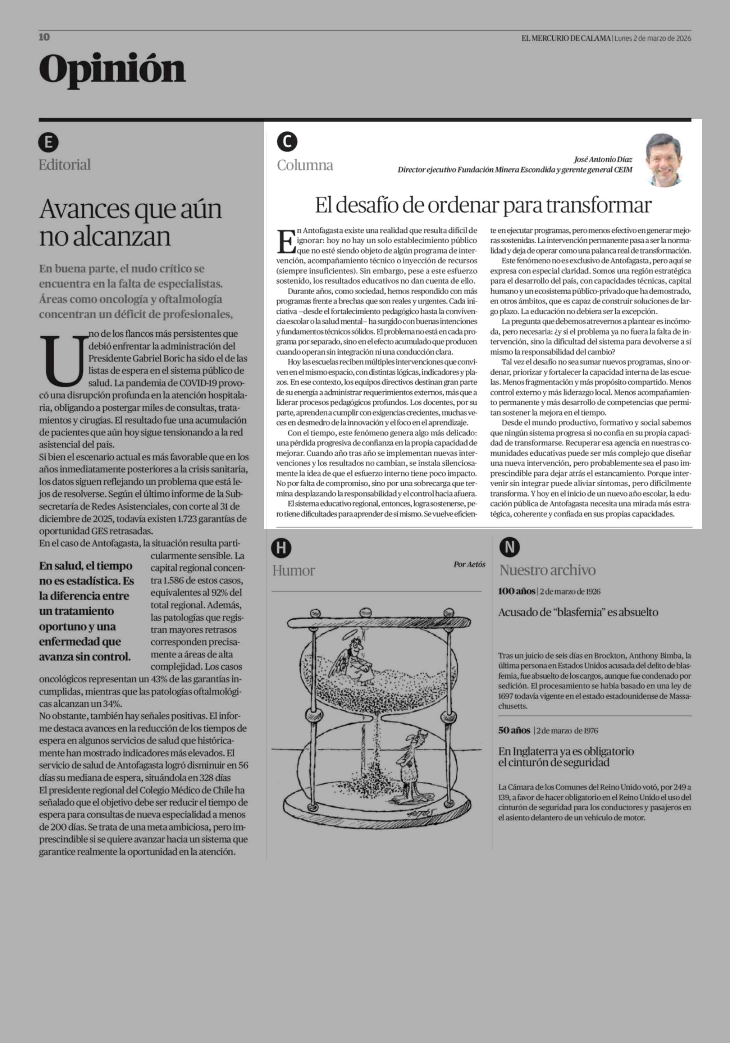Columnas de Opinión: El desafío de ordenar para transformar 02-03-2026 El Mercurio de Calama |
