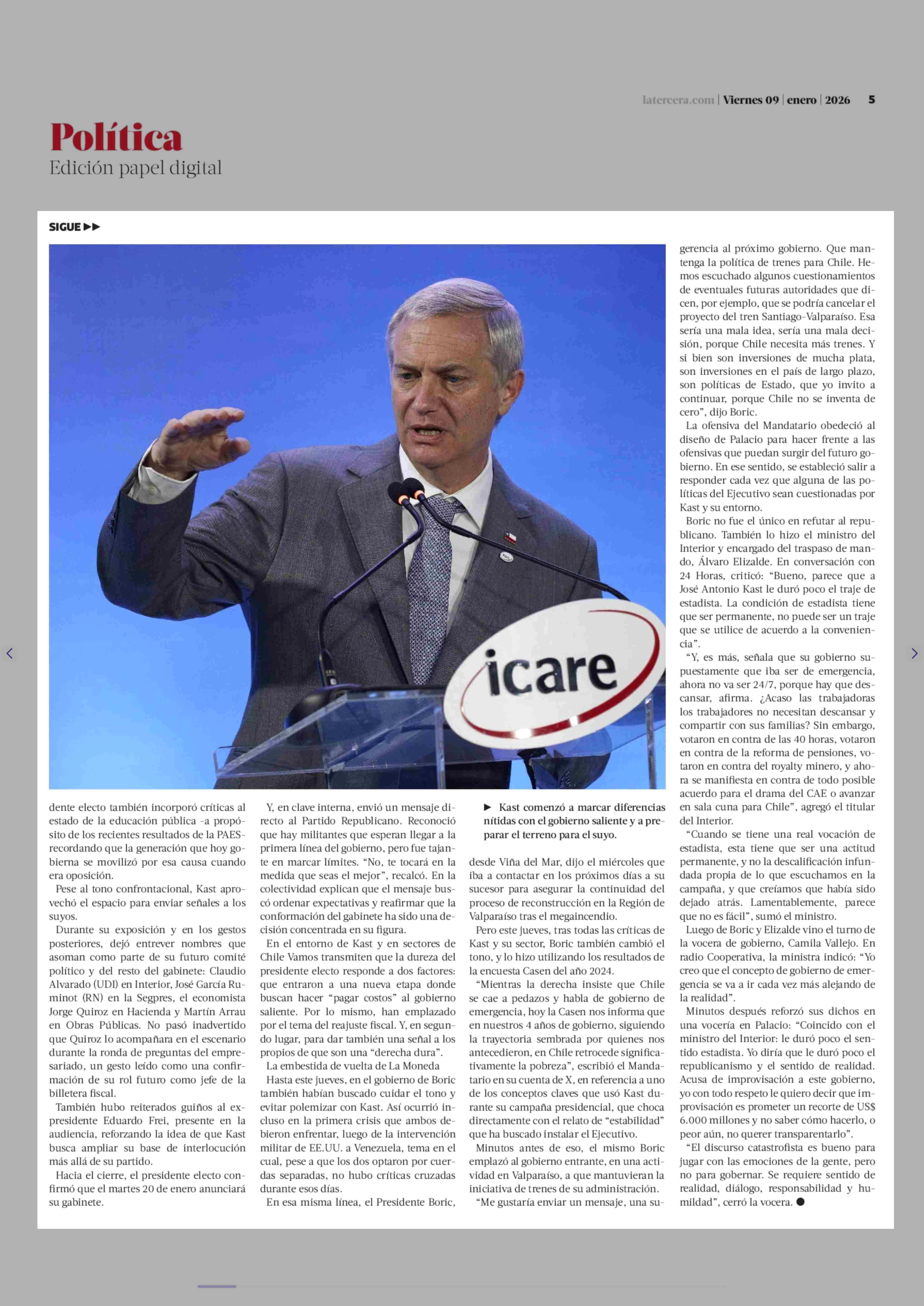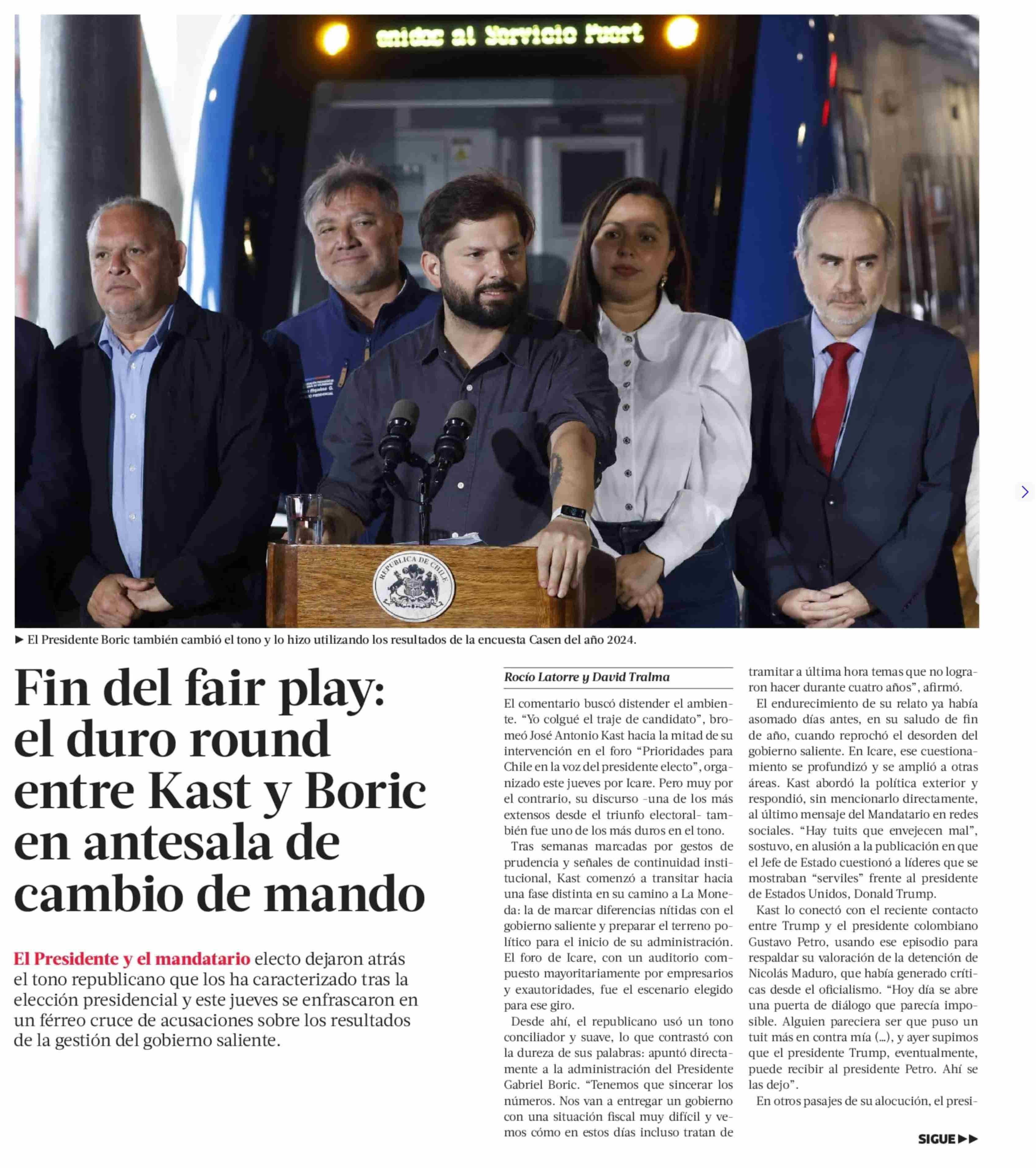 Fin del fair play: el duro round entre Kast y Boric en antesala de cambio de mando 09-01-2026 La Tercera |