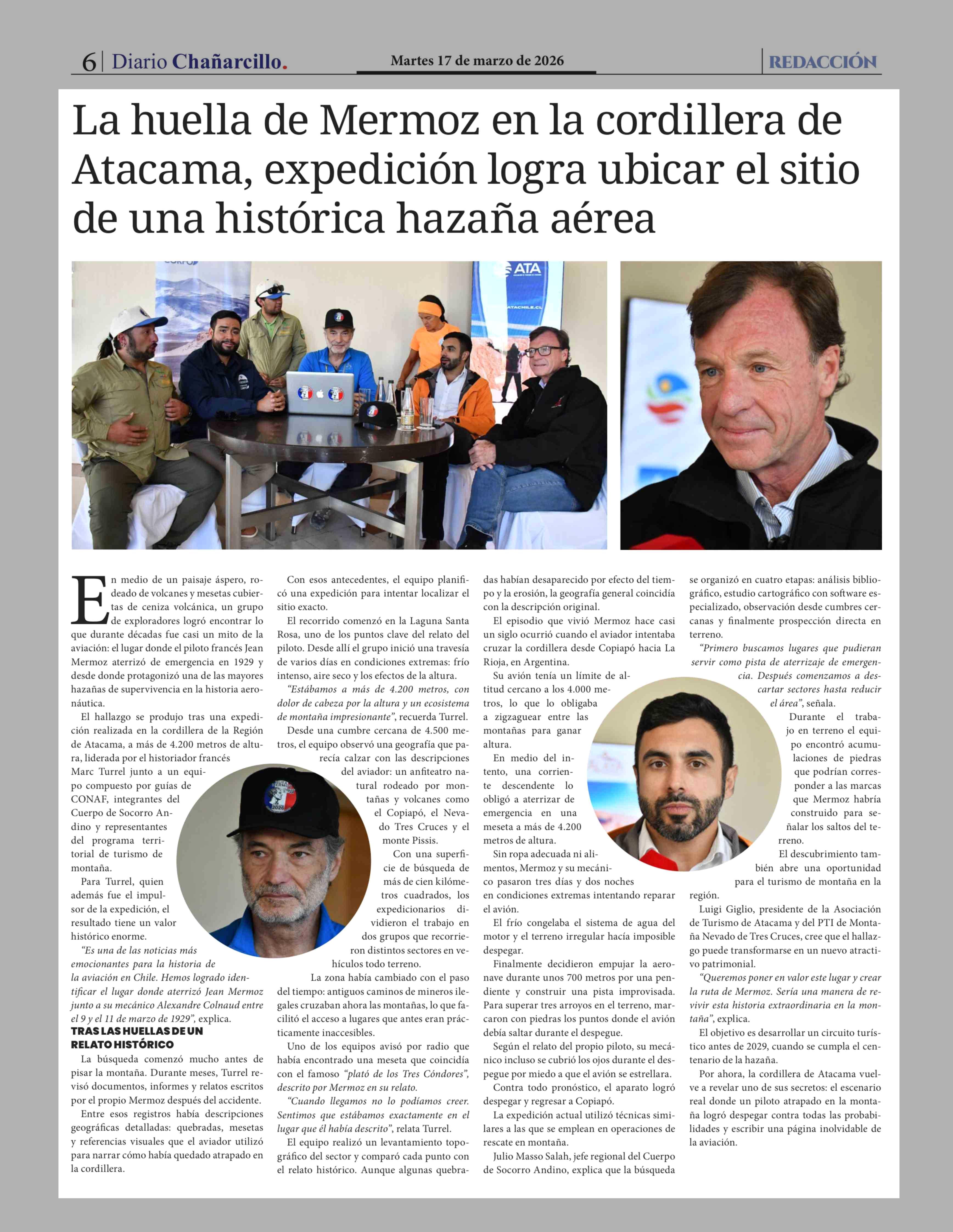La huella de Mermoz en la cordillera de Atacama, expedición logra ubicar el sitio de una histórica hazaña aérea 17-03-2026 Diario Chañarcillo |