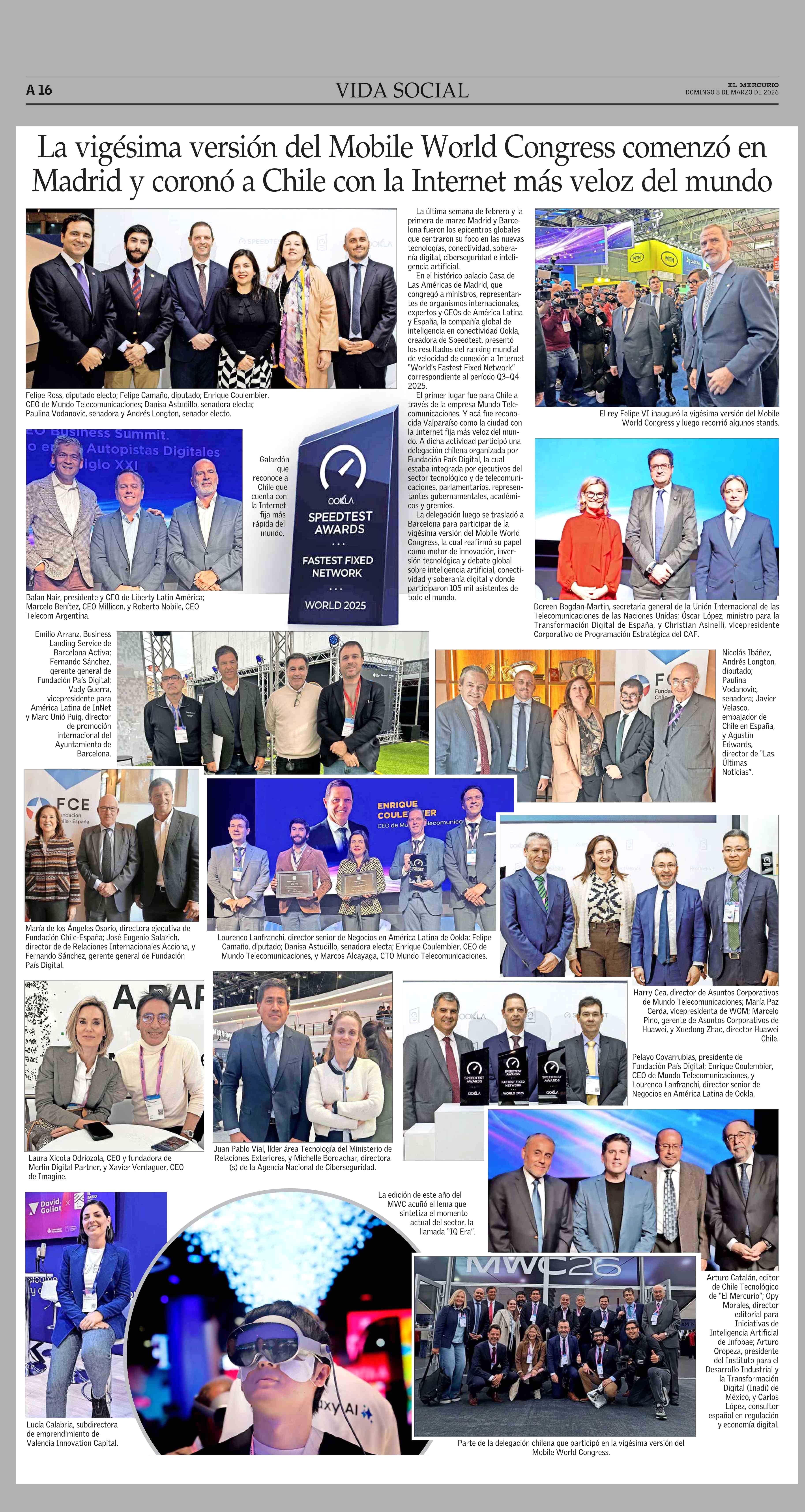 La vigésima versión del Mobile World Congress comenzó en Madrid y coronó a Chile con la Internet más veloz del mundo 08-03-2026 El Mercurio |