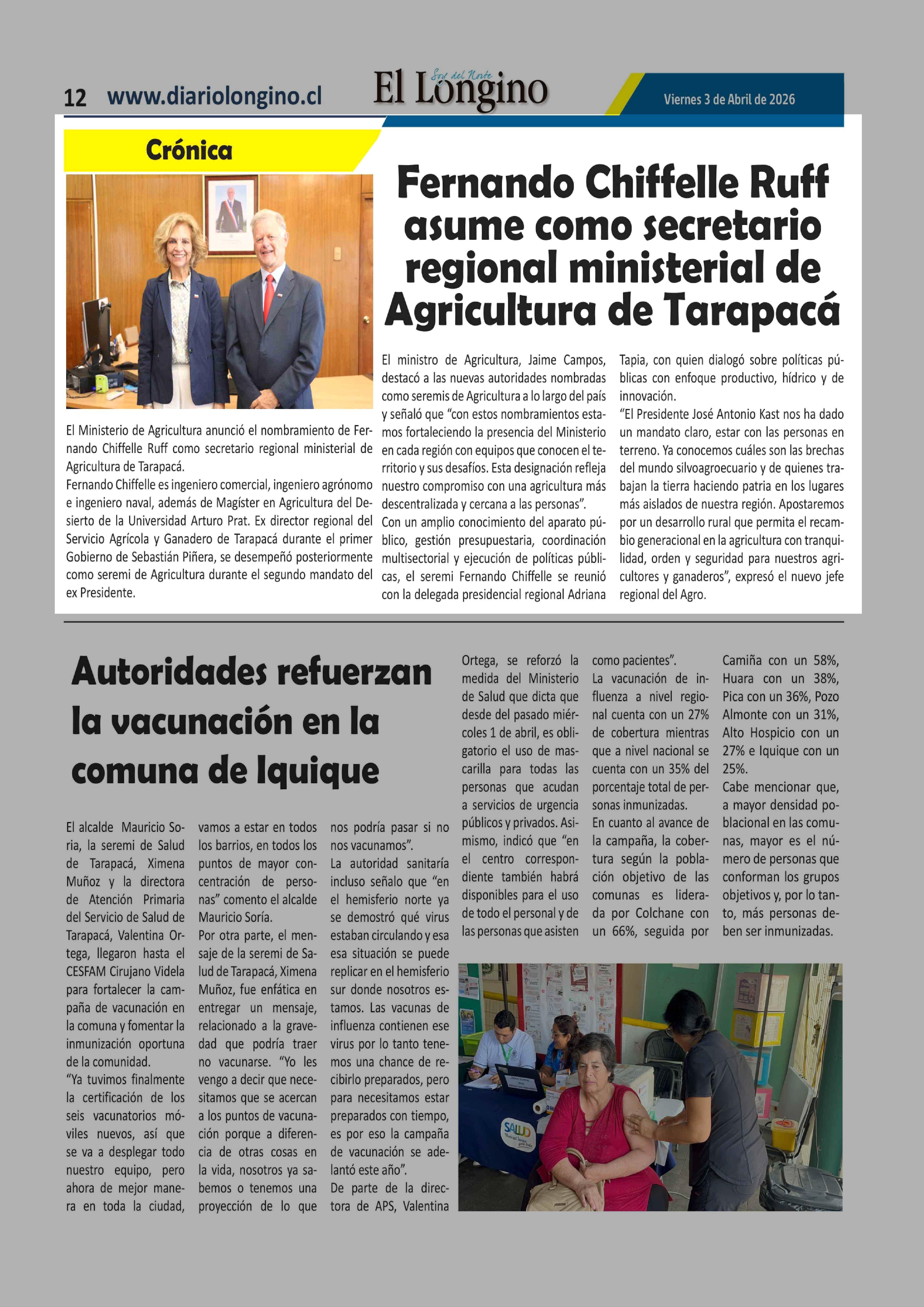Fernando Chiffelle Ruff asume como secretario regional ministerial de Agricultura de Tarapacá 03-04-2026 El Longino |