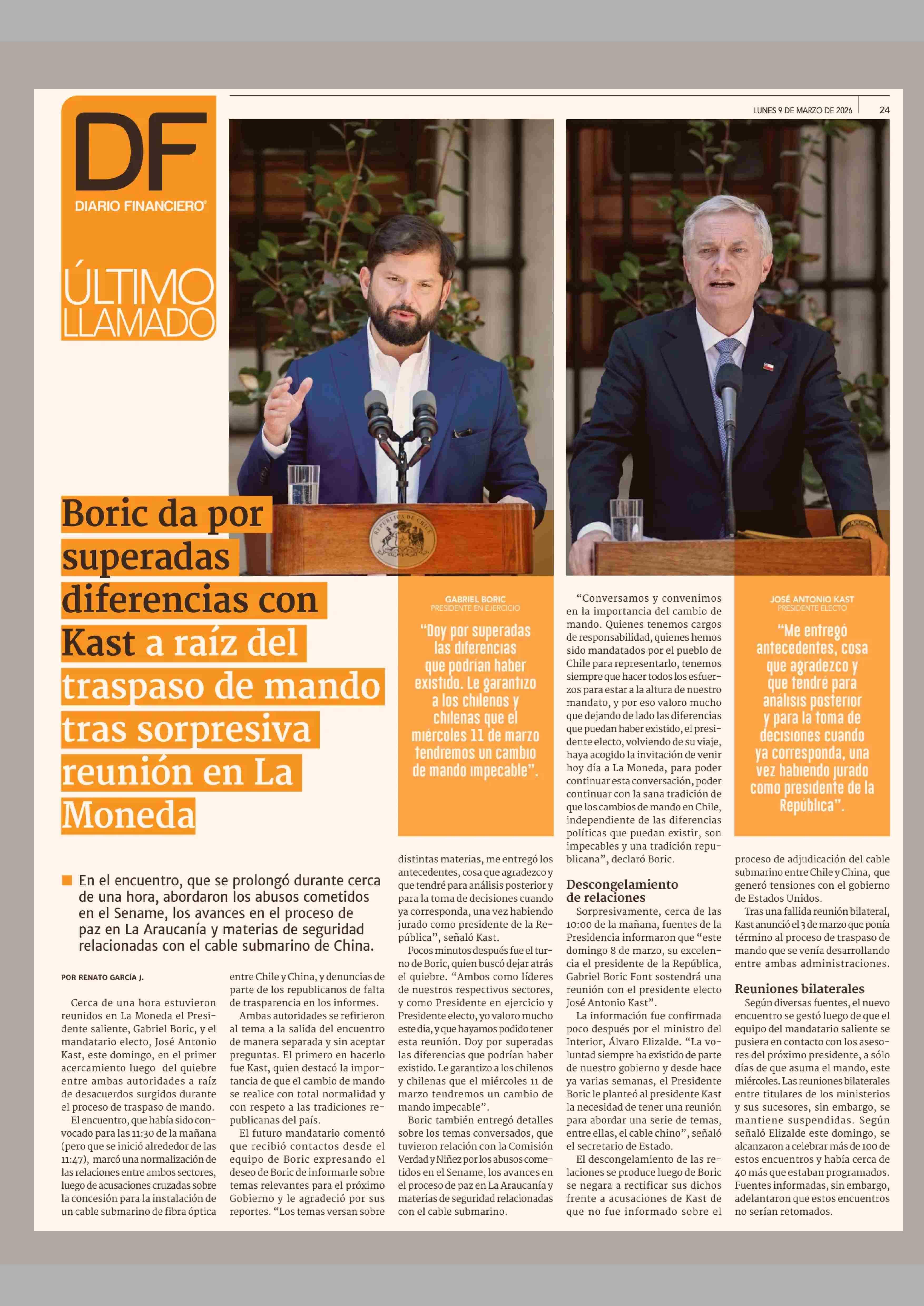 Boric da por superada diferencias con Kast a raí del traspaso de mando tras sorpresiva reunión en La Moneda 09-03-2026 Diario Financiero |