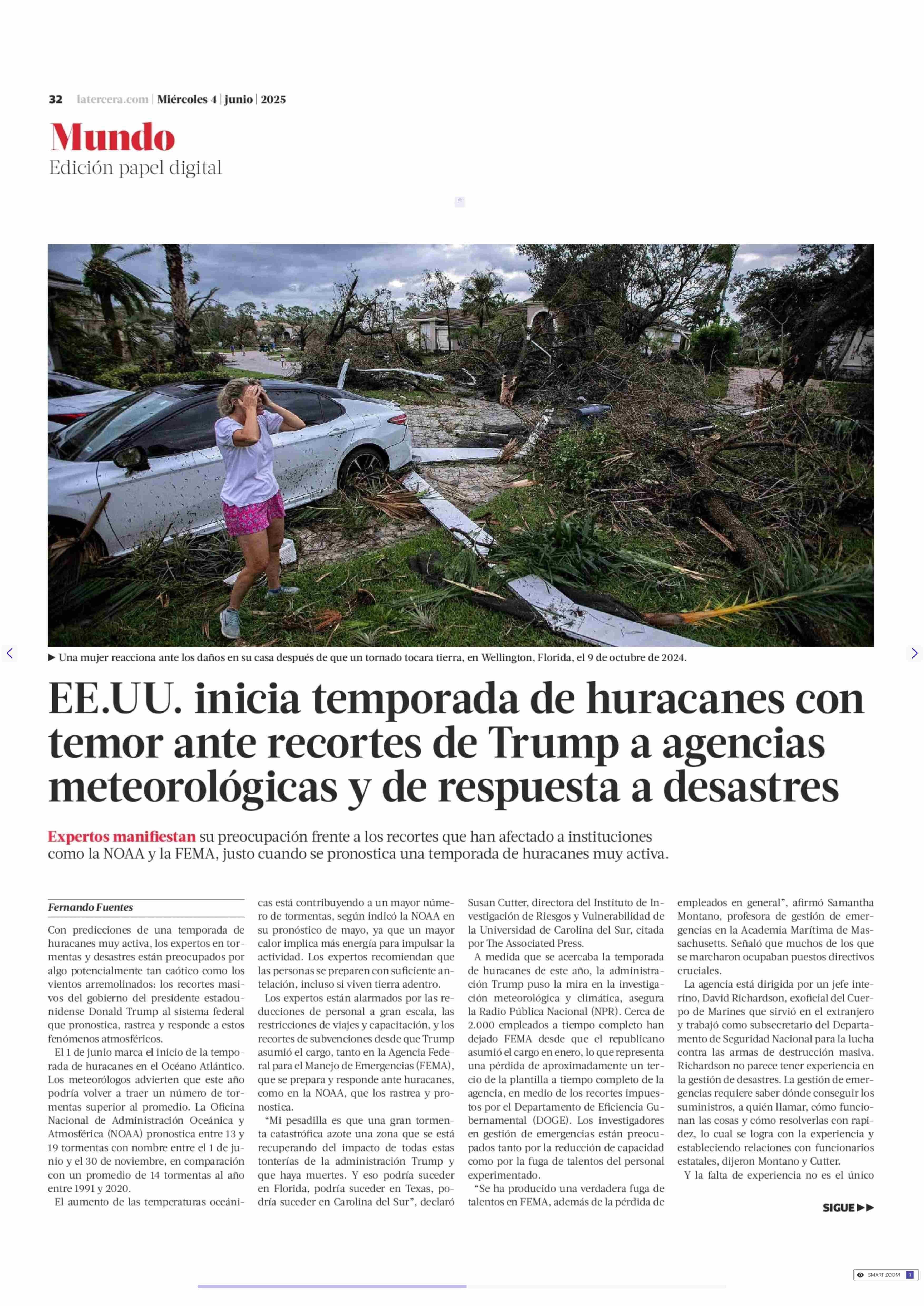 EE.UU. inicia temporada de huracanes con temor ante recortes de Trump a agencias meteorológicas y de respuesta a desastres 04-06-2025 La Tercera |