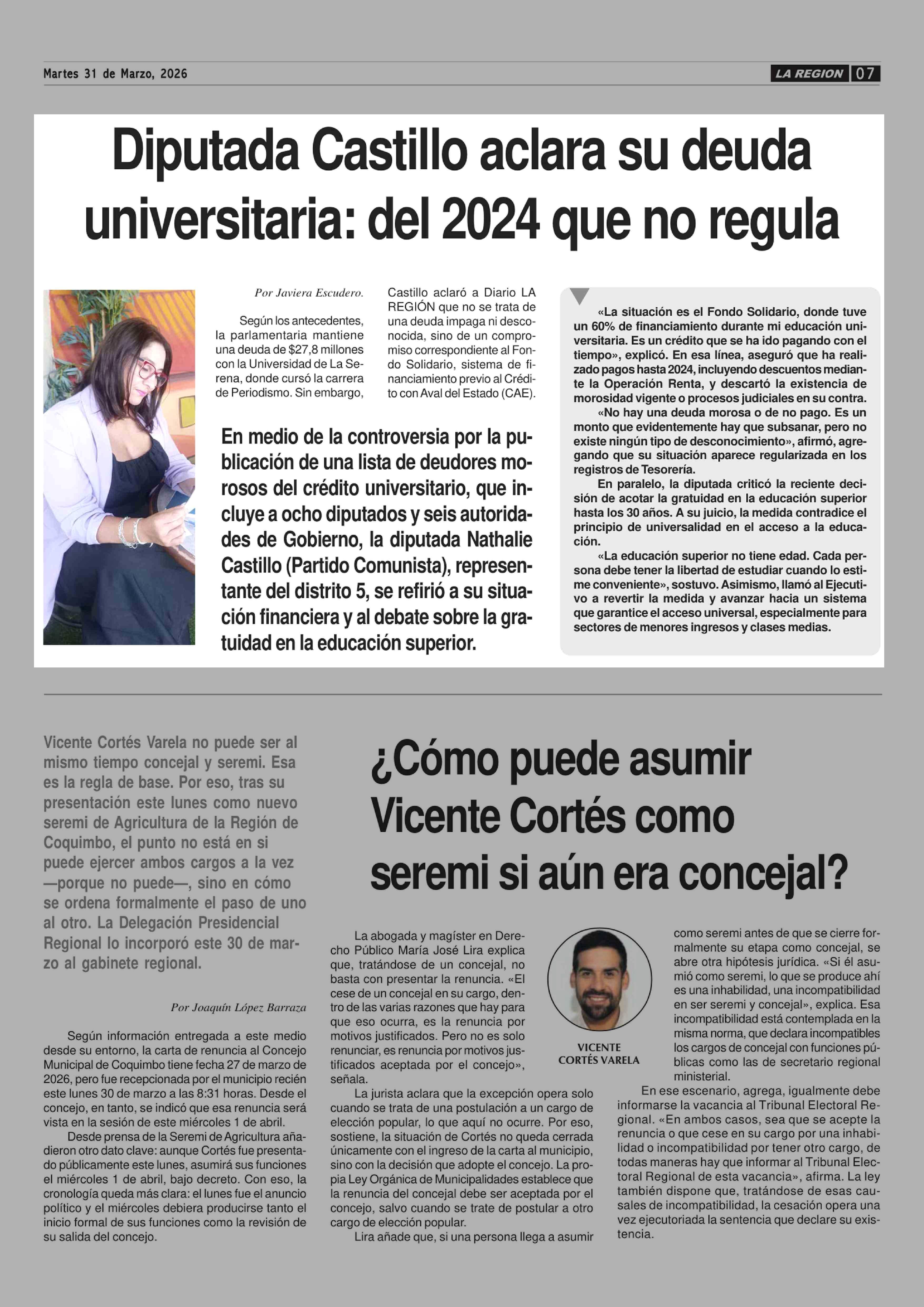 Diputada Castillo aclara su deuda universitaria: del 2024 que no regula 31-03-2026 Diario la Región |