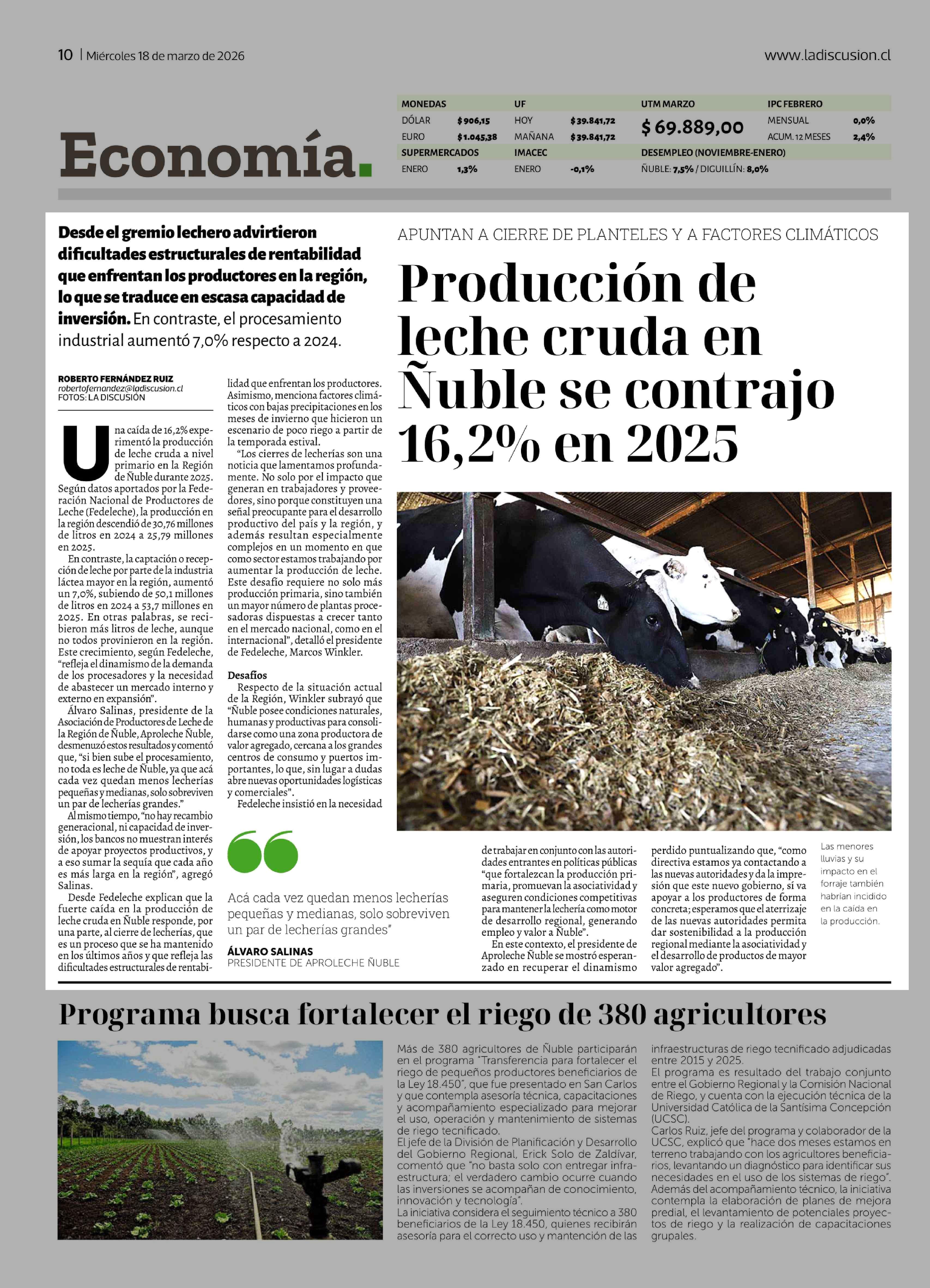 Título: Producción de leche cruda en Ñuble se contrajo 16,2% en 2025