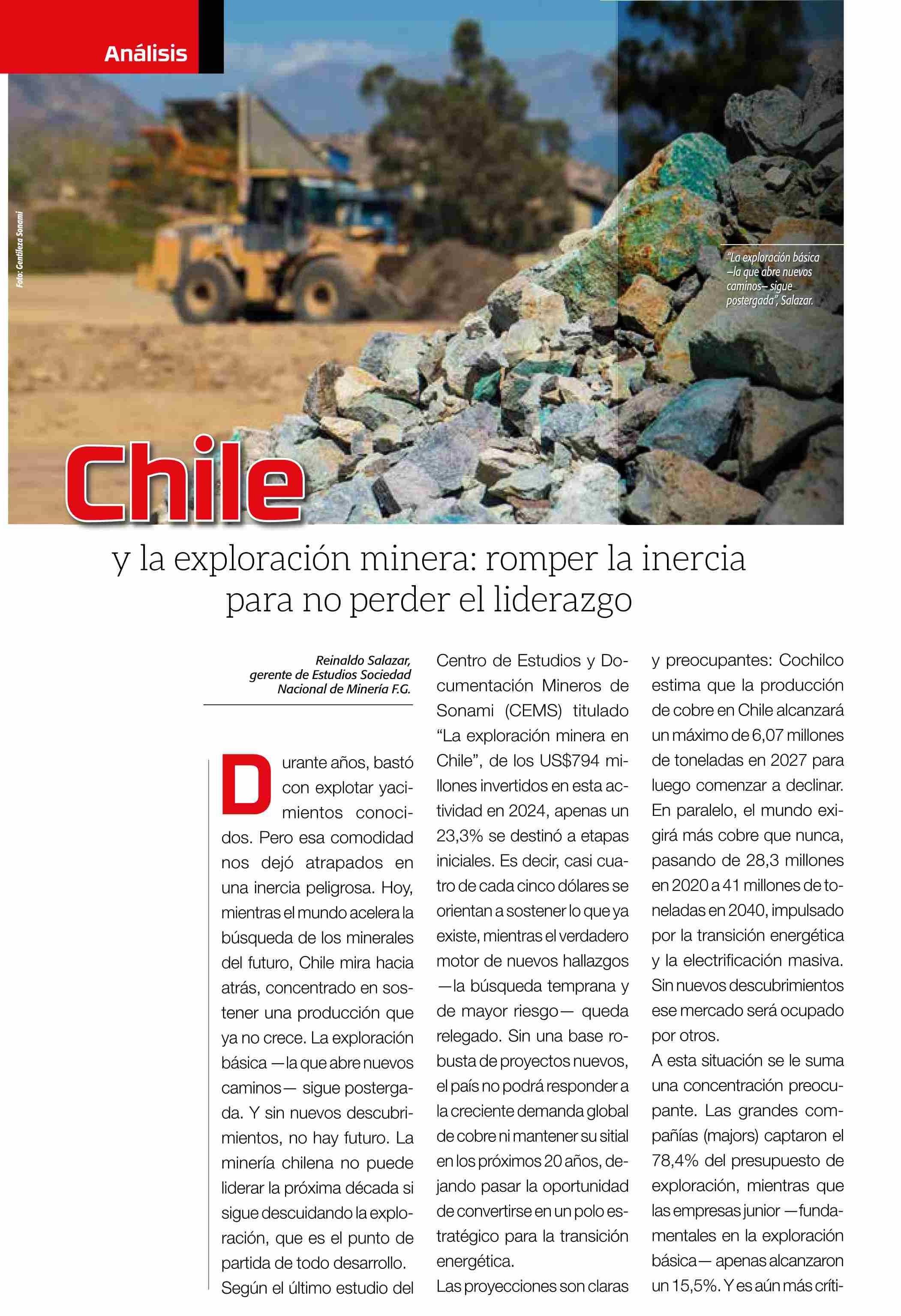 Chile y la exploración minera: romper la inercia para no perder el liderazgo 27-05-2025 Revista Minería Chilena |