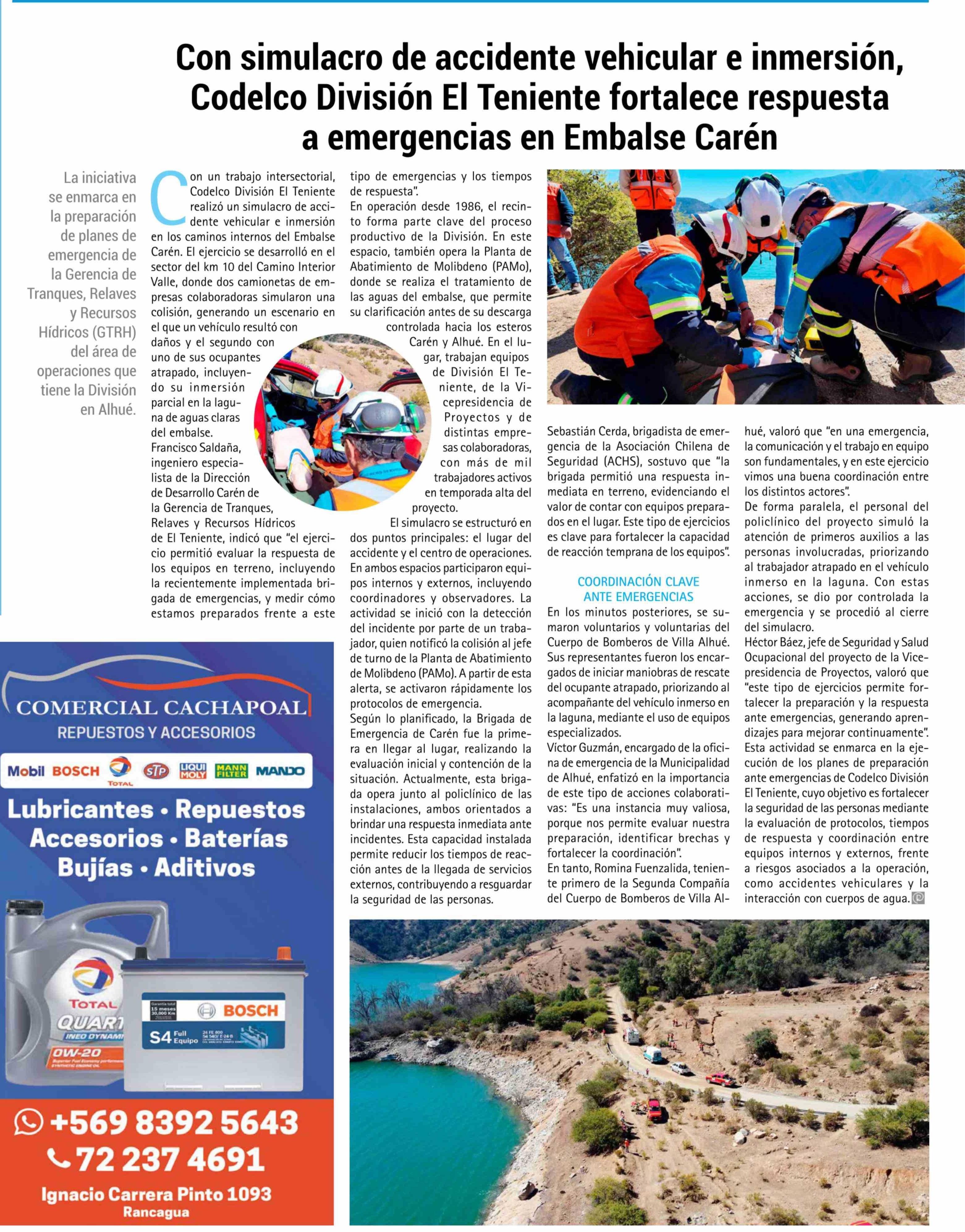 Con simulacro de accidente vehicular e inmersión, Codelco División El Teniente fortalece respuesta a emergencias en Embalse Carén 02-04-2026 El Rancagüino |