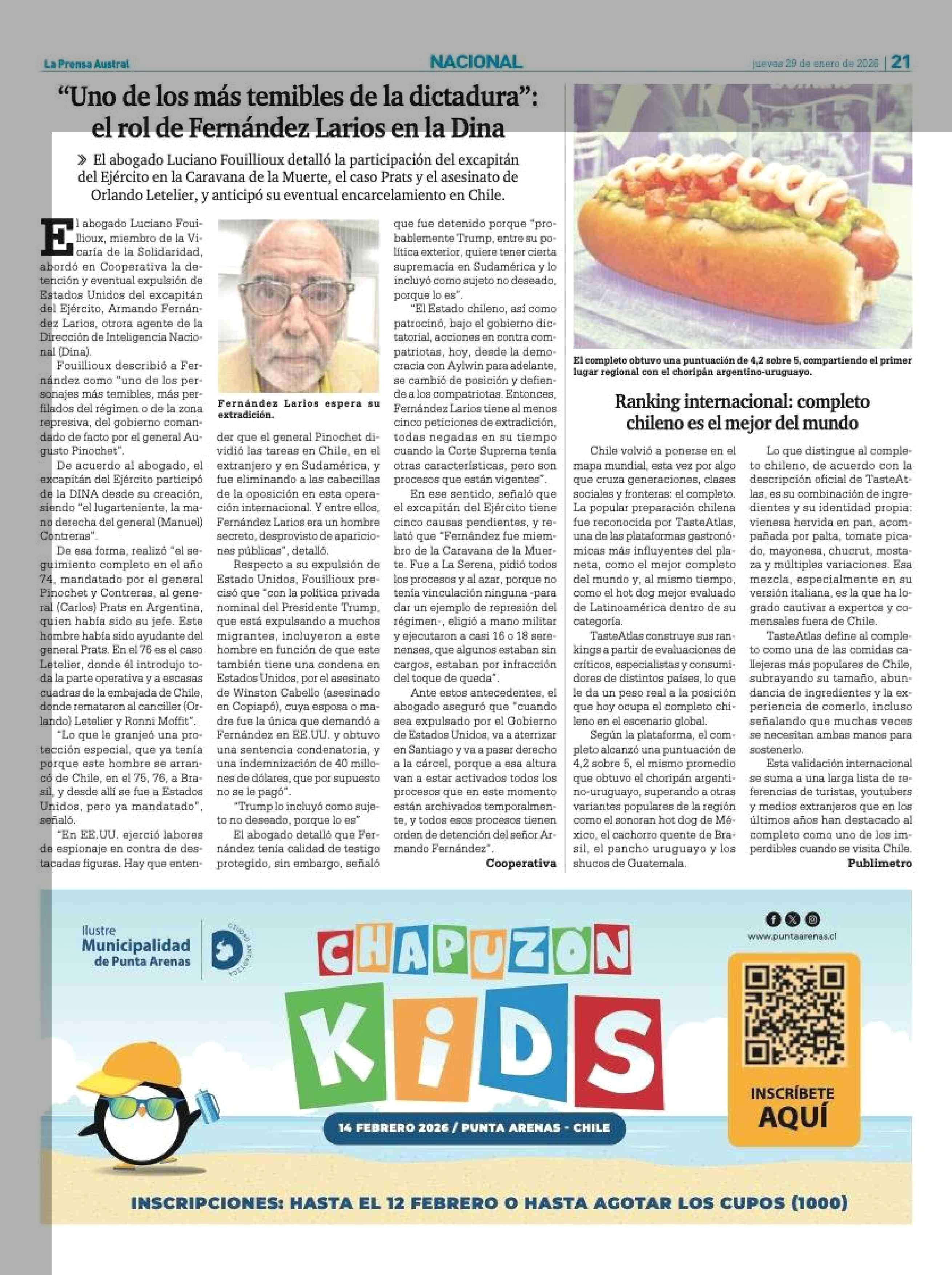 "Uno de los más temibles de la dictadura": el rol de Fernández Larios en la Dina 29-01-2026 La Prensa Austral |