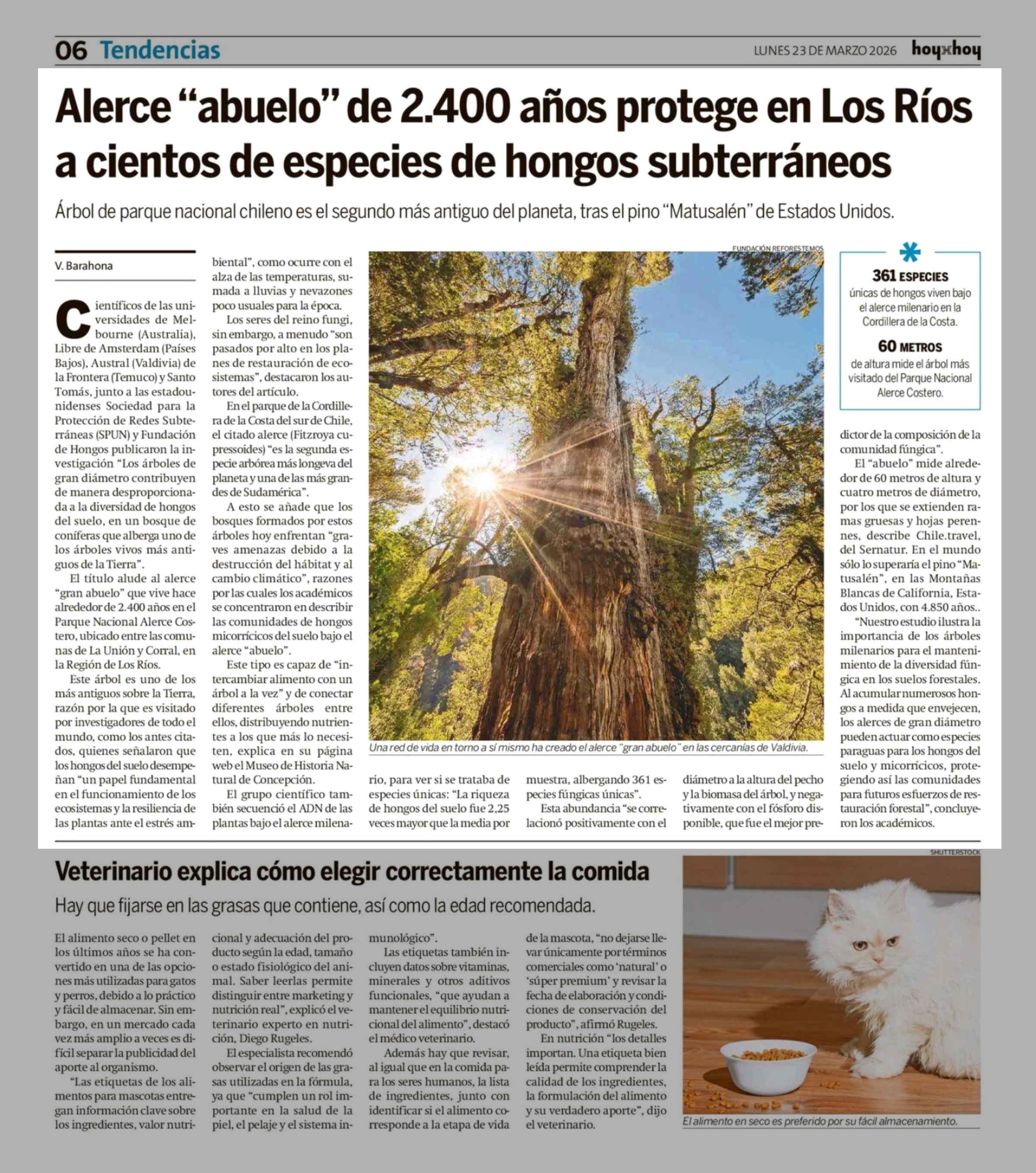 Alerce "abuelo" de 2.400 años protege en Los Ríos a cientos de especies de hongos subterráneos 23-03-2026 Hoy x Hoy |