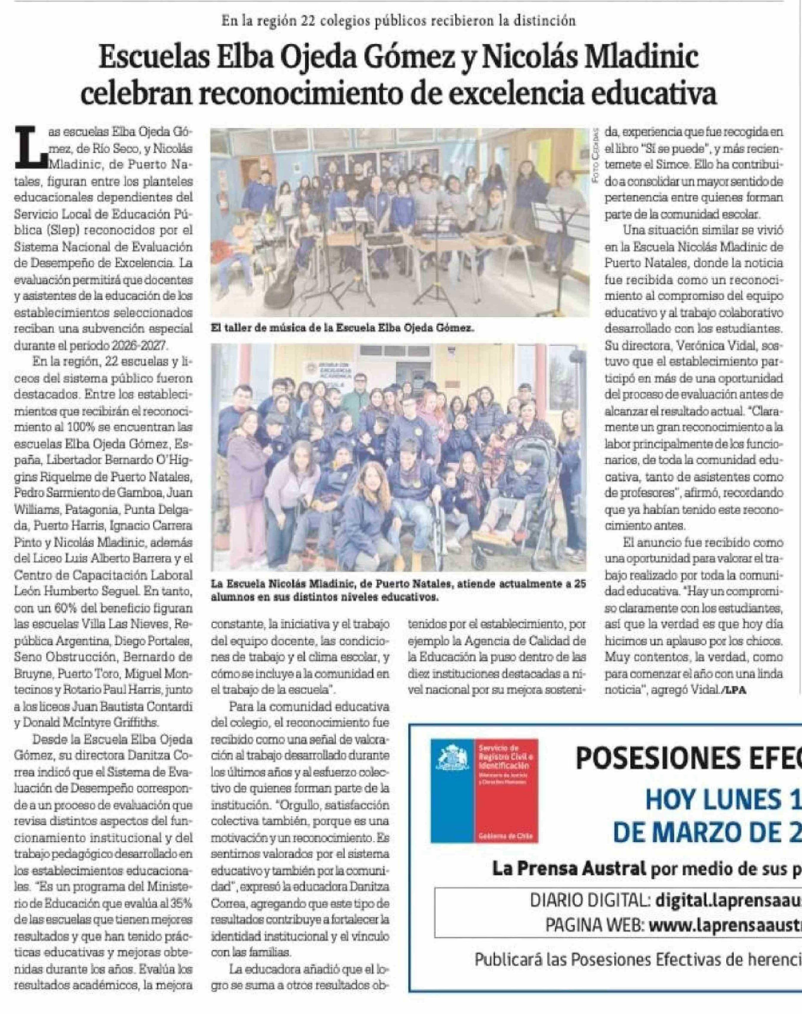 Escuelas Elba Ojeda Gómez y Nicolás Mladinic celebran reconocimiento de excelencia educativa 16-03-2026 La Prensa Austral |
