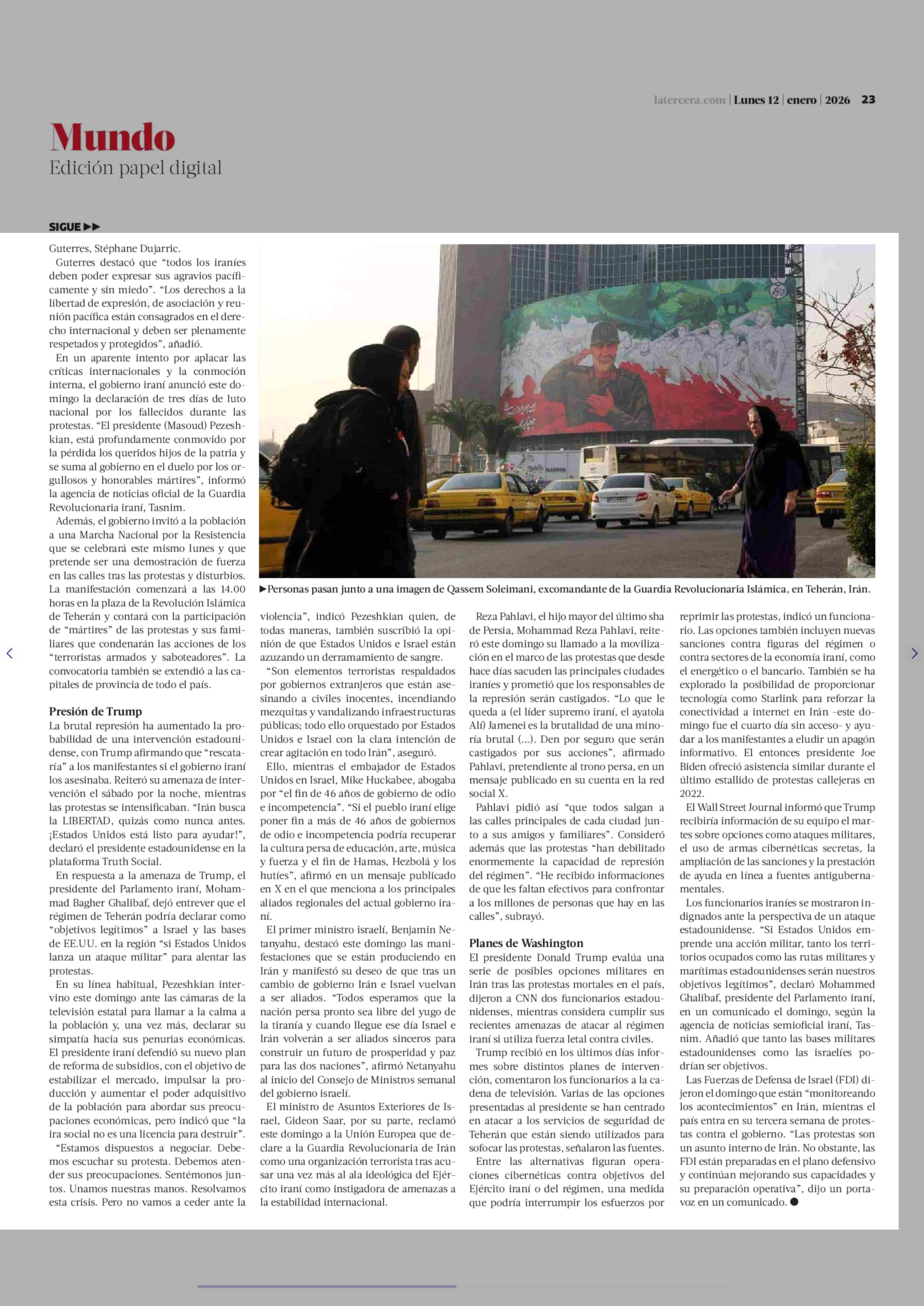 Irán advierte a EE.UU. contra eventual ataque mientras aumenta número de fallecidos en protestas 12-01-2026 La Tercera |
