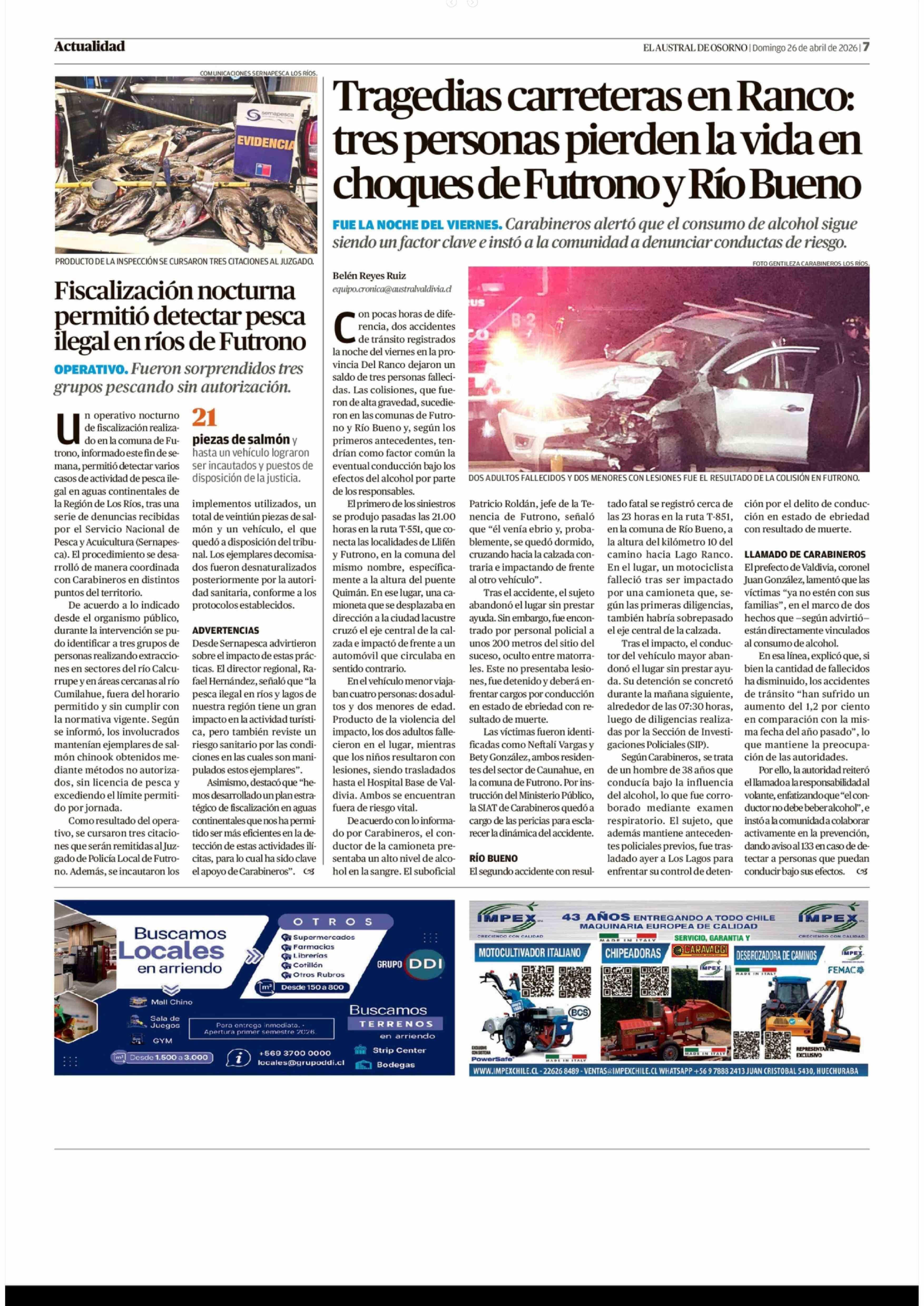 Fiscalización nocturna permitió detectar pesca ilegal en ríos de Futrono 26-04-2026 El Austral de Osorno |