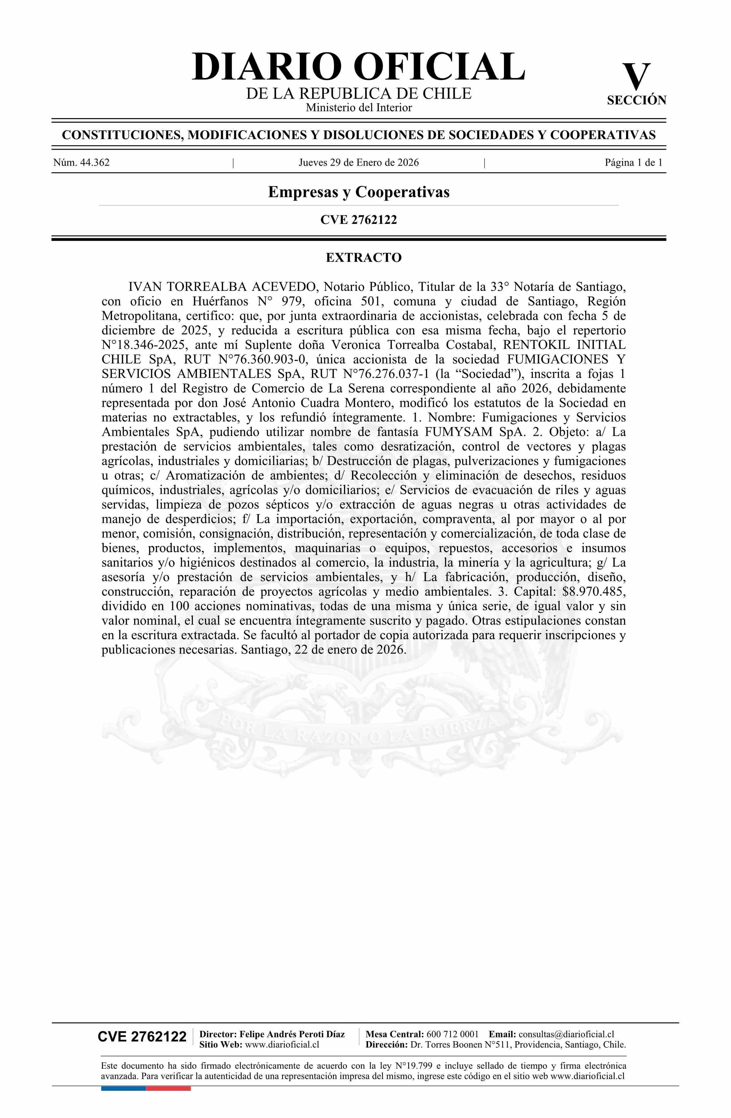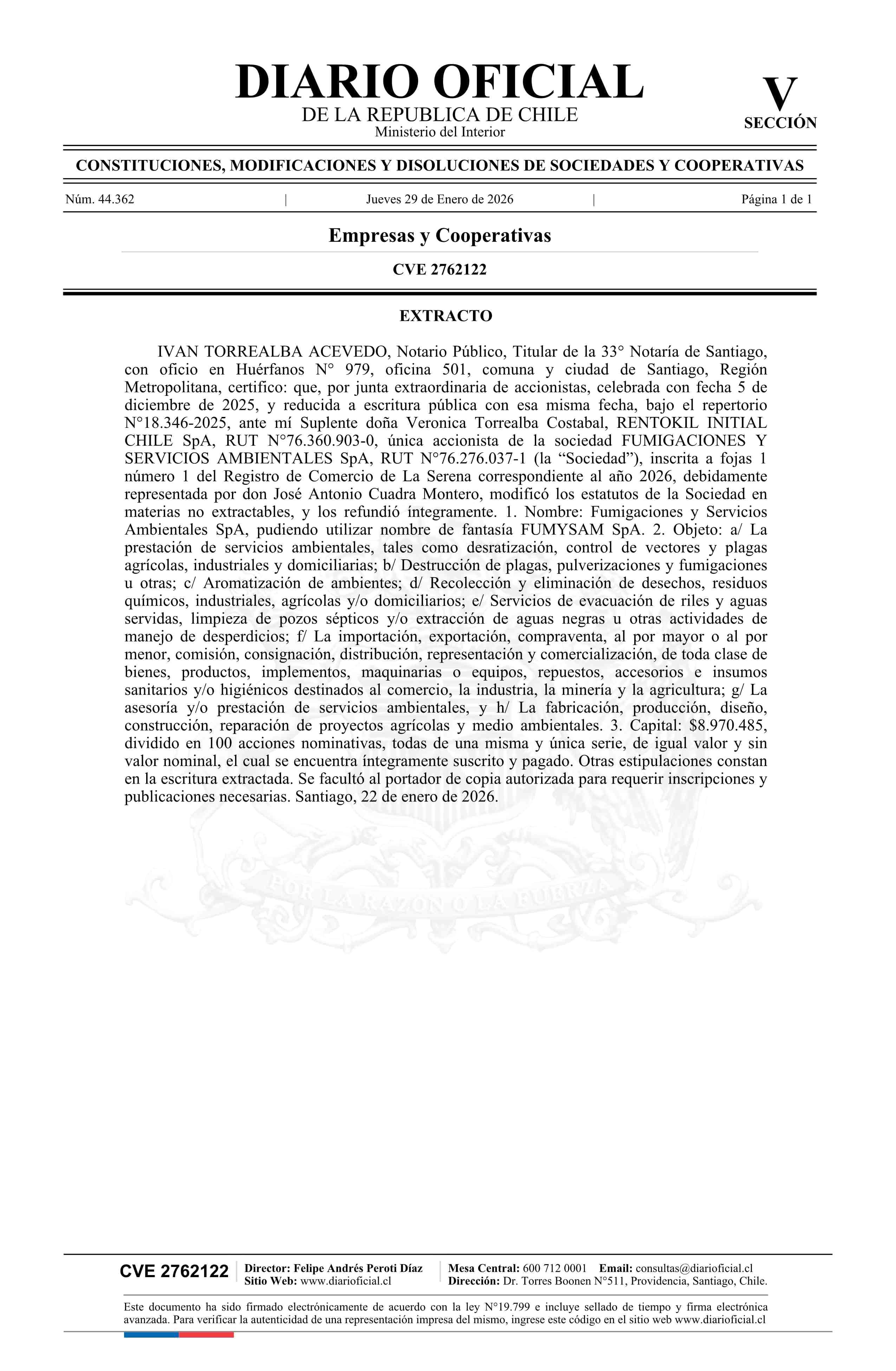 Fumigaciones y Servicios Ambientales SpA 76.276.037-1* 29-01-2026 Diario Oficial Edición Electrónica |