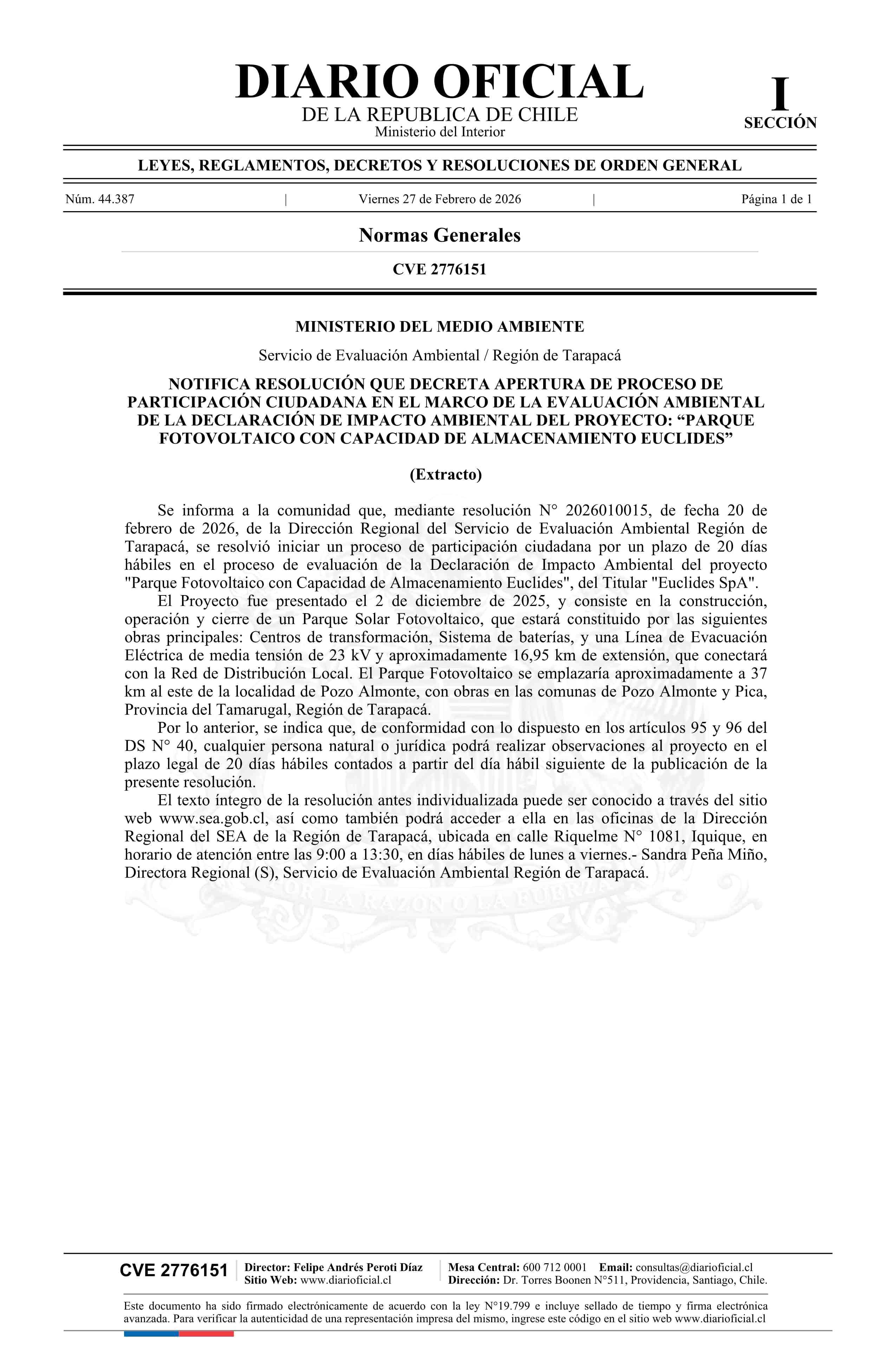 Título: Extracto de resolución número 2026010015, de 2026.- Inicia proceso de participación ciudadana en el marco de la evaluación ambiental de la Declaración de Impacto Ambiental del proyecto Parque Fotovoltaico con Capacidad de Almacenamiento Euclides