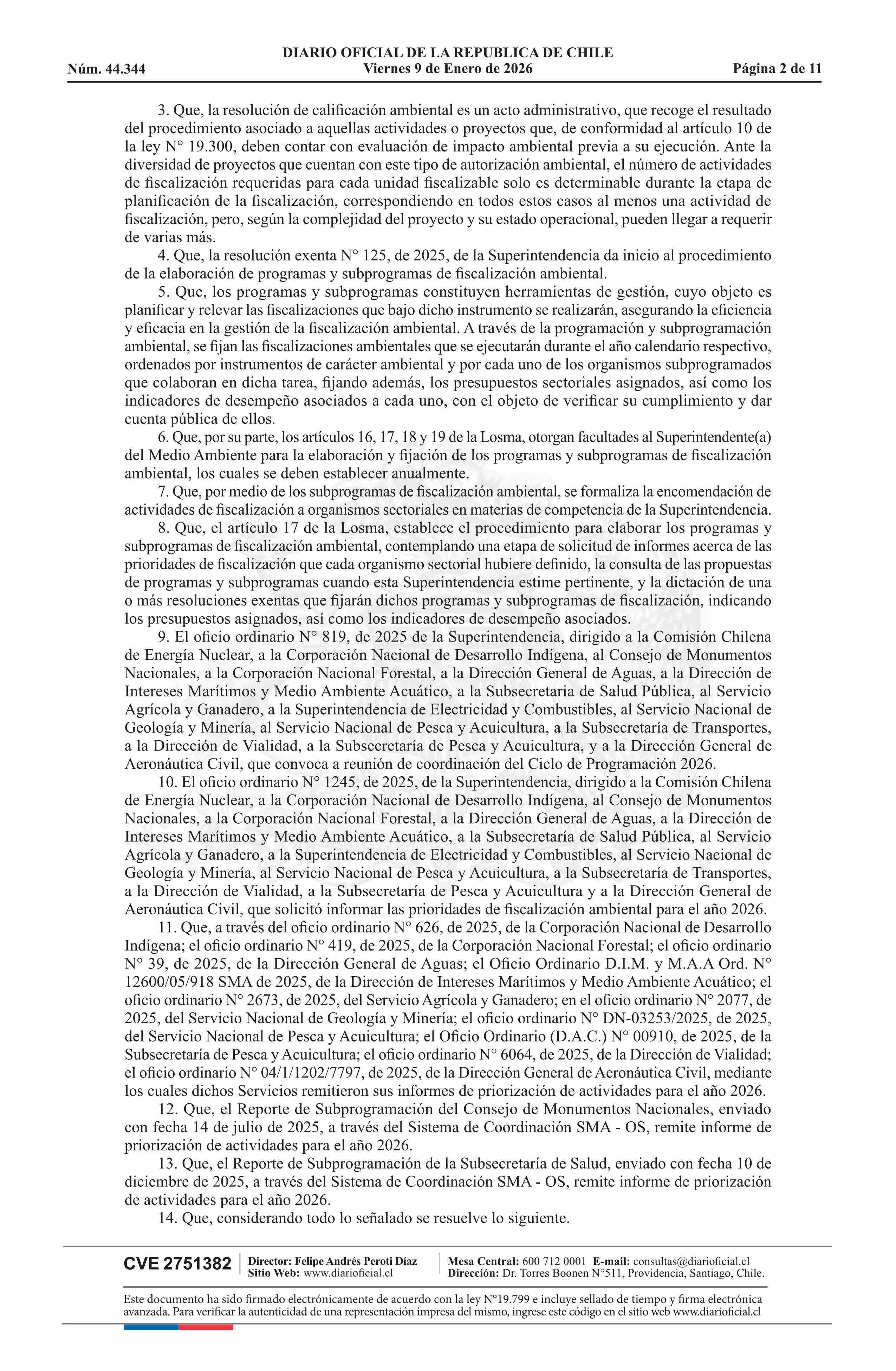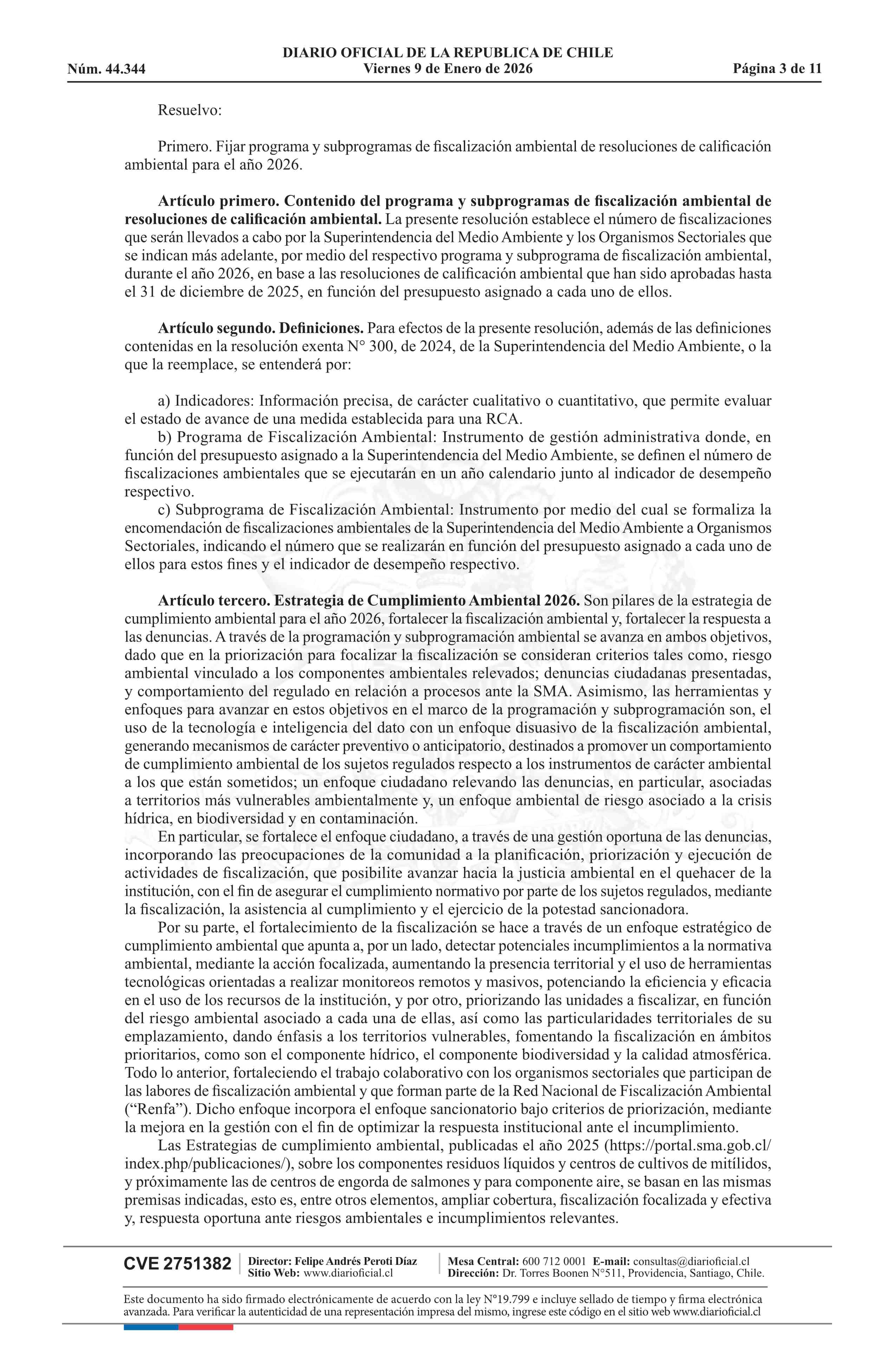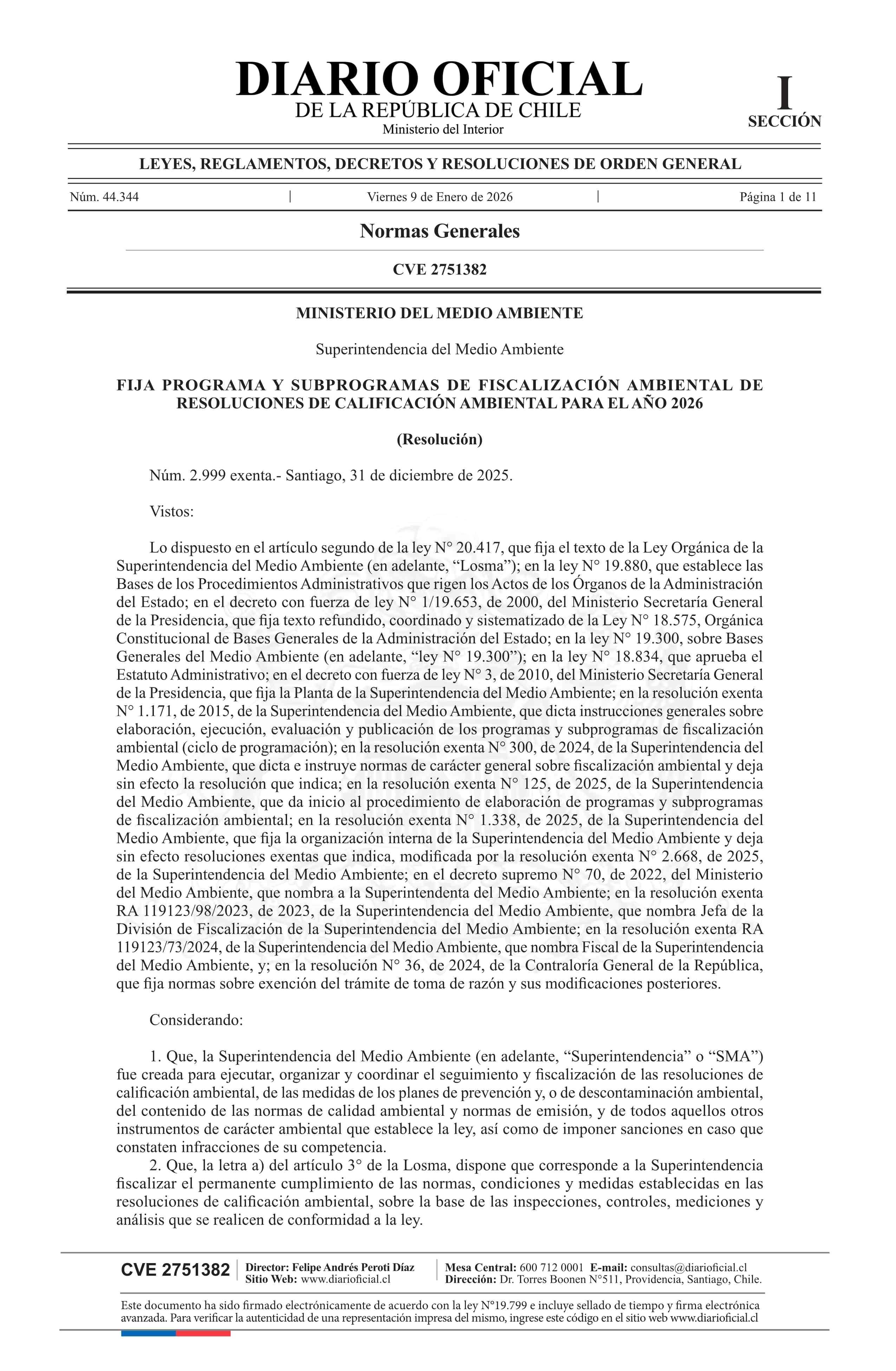Título: AVISO LICITACIONES: Resolución exenta número 2.999, de 2025.- Fija programa y subprogramas de fiscalización ambiental de resoluciones de calificación ambiental para el año 2026