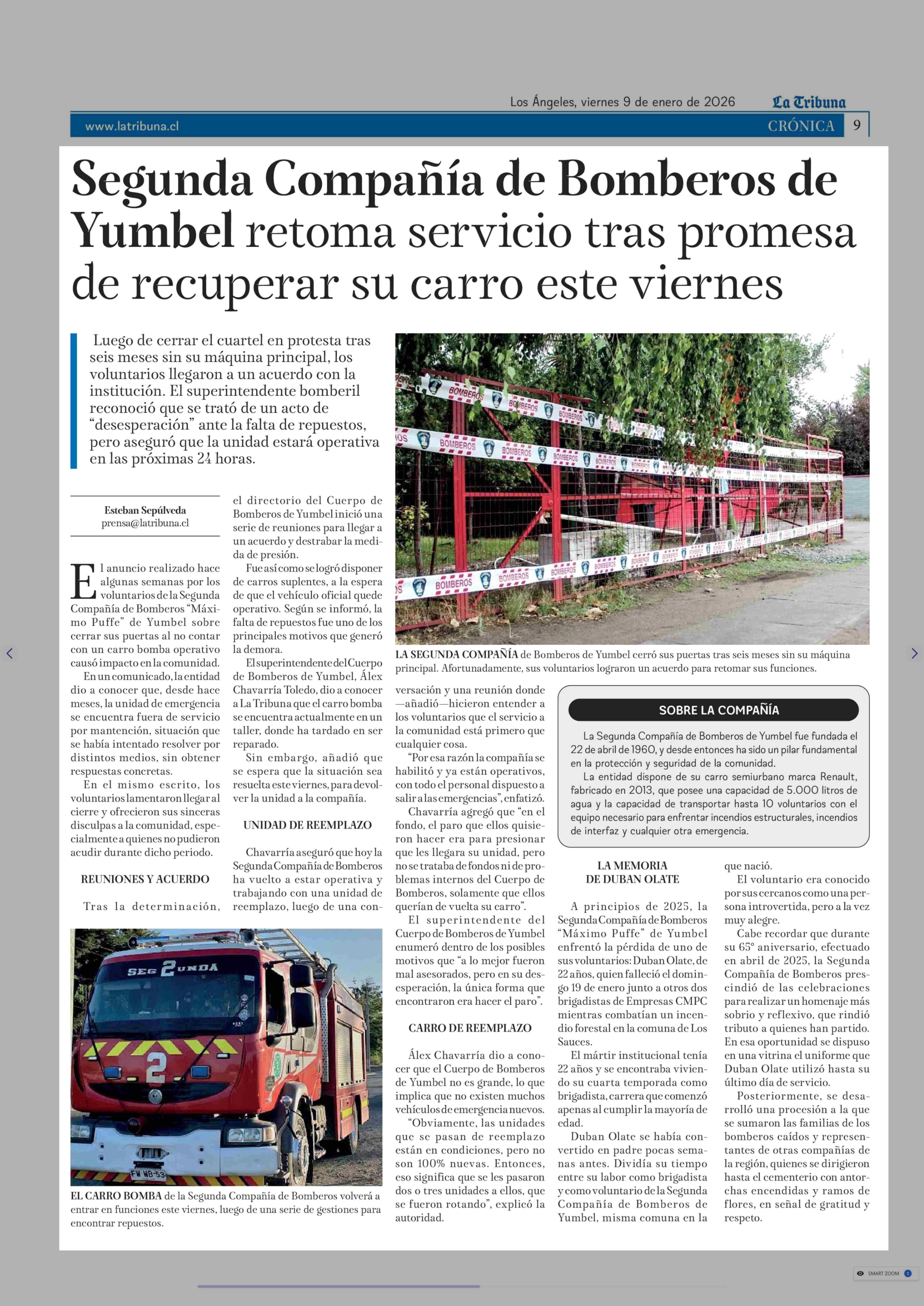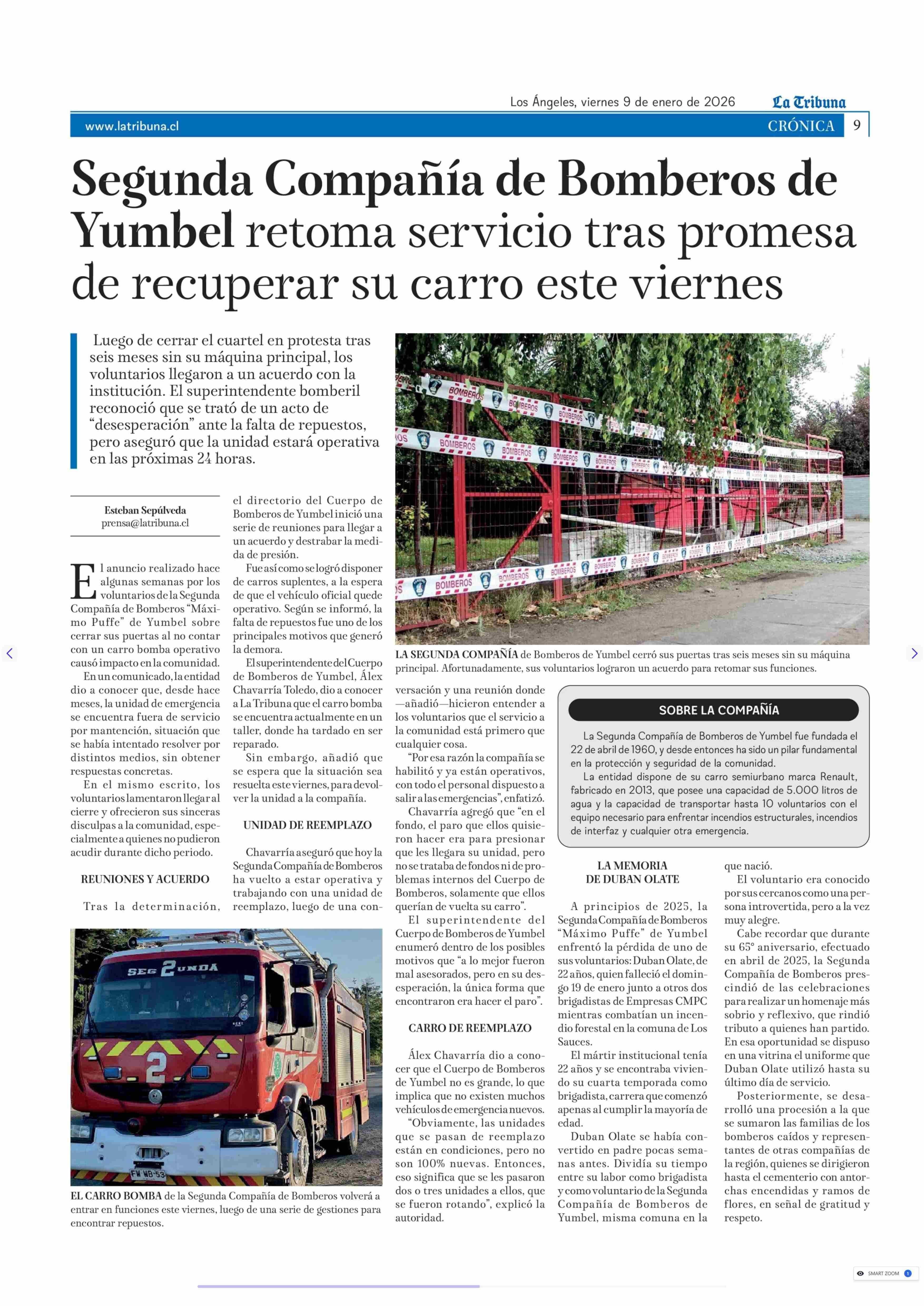 Título: Segunda Compañía de Bomberos de Yumbel retoma servicio tras promesa de recuperar su carro este viernes