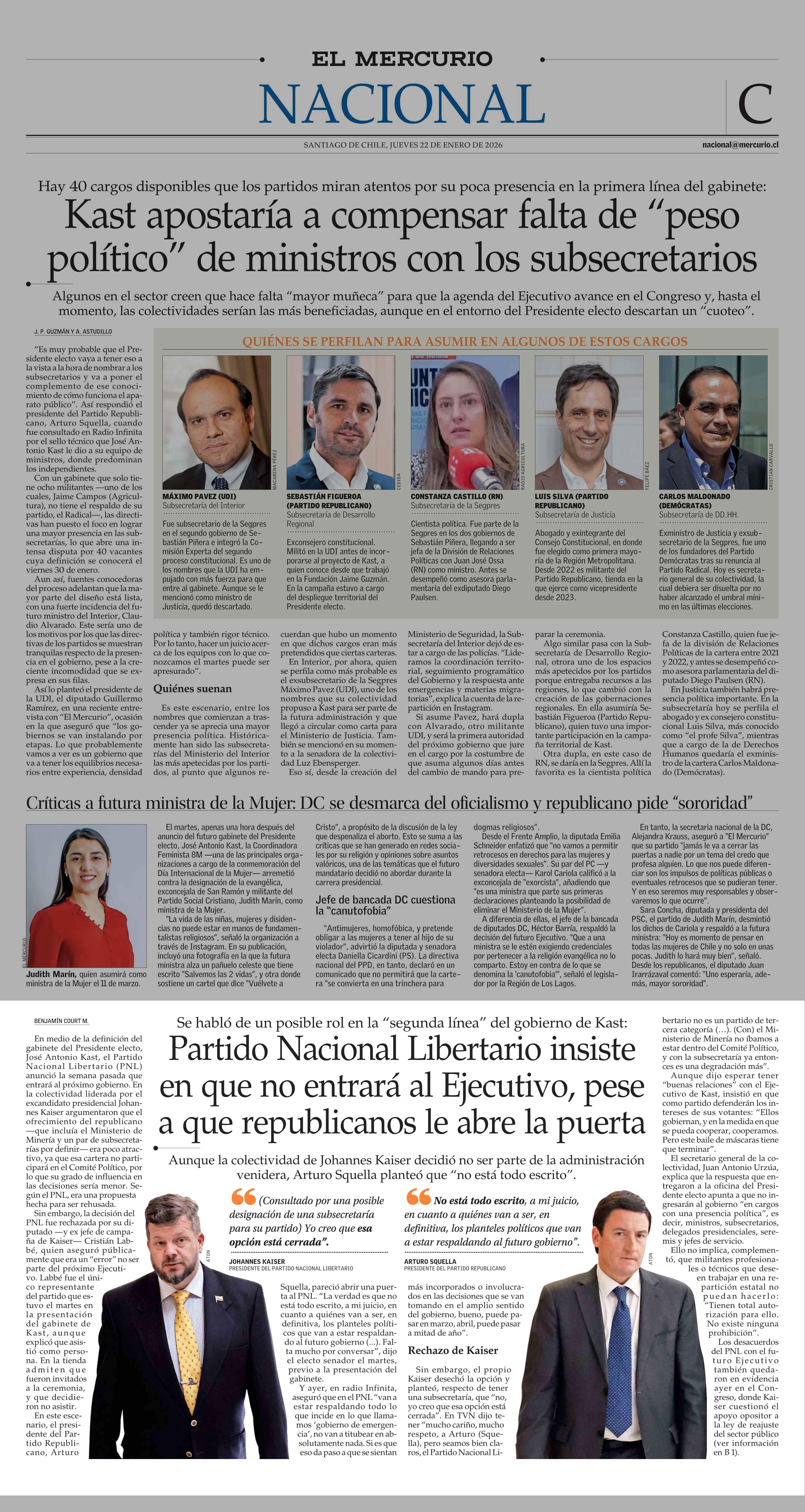 Partido Nacional Libertario insiste en que no entrará al Ejecutivo, pese a que republicanos le abre la puerta 22-01-2026 El Mercurio |