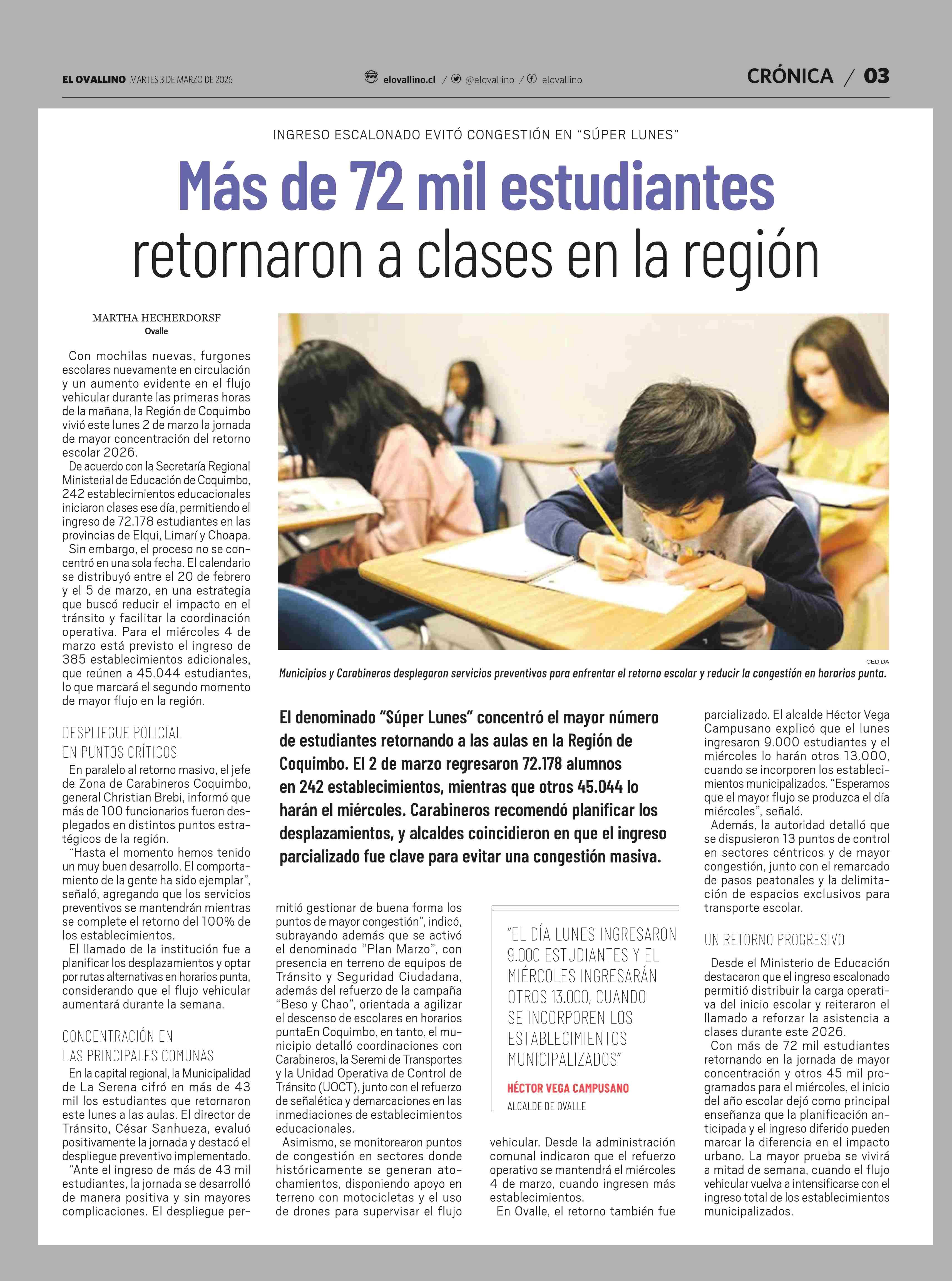 Más de 72 mil estudiantes retornaron a clases en la región 03-03-2026 El Ovallino |