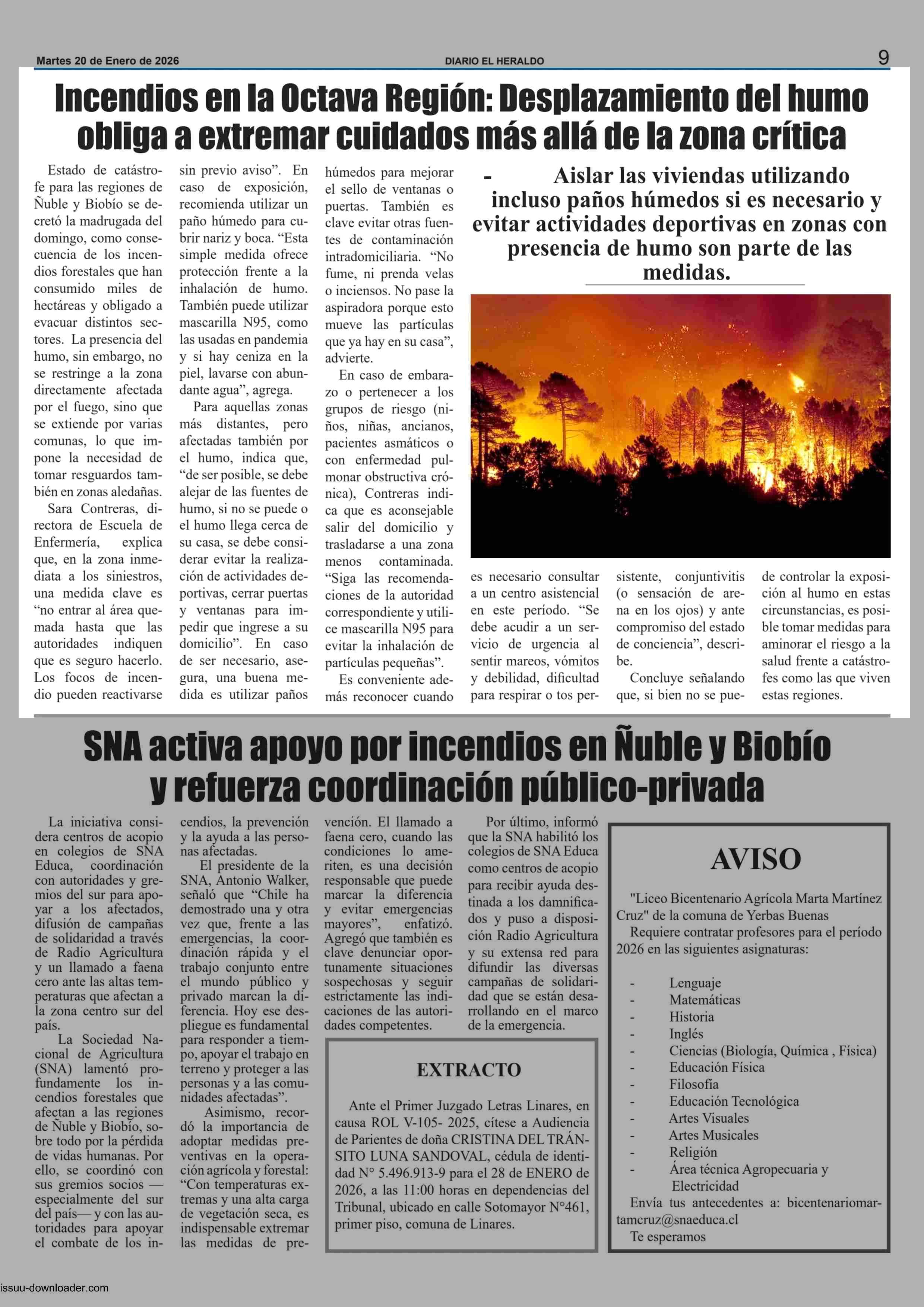 Incendios en la Octava Región: Desplazamiento del humo obliga a extremar cuidados más allá de la zona crítica 20-01-2026 El Heraldo |
