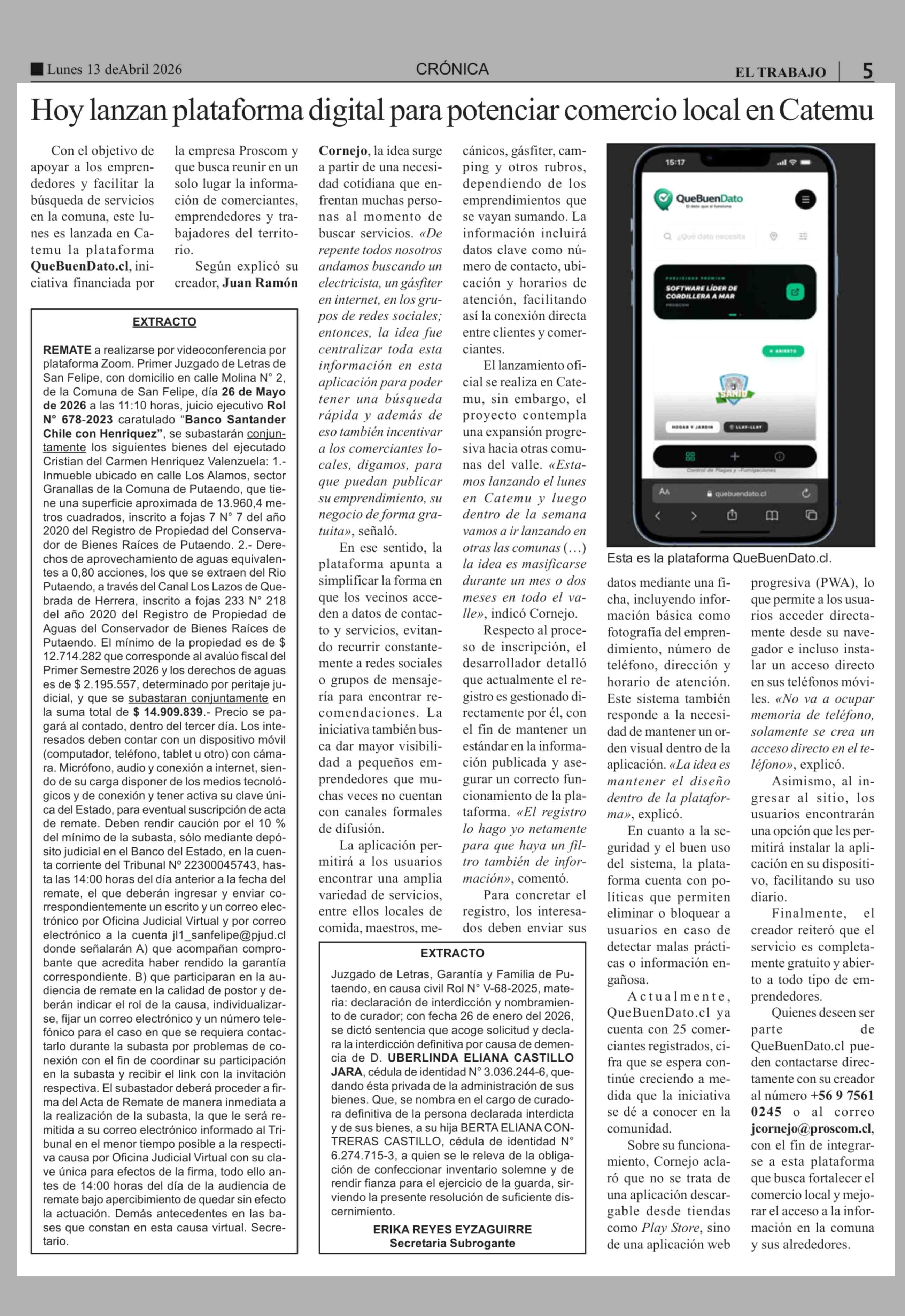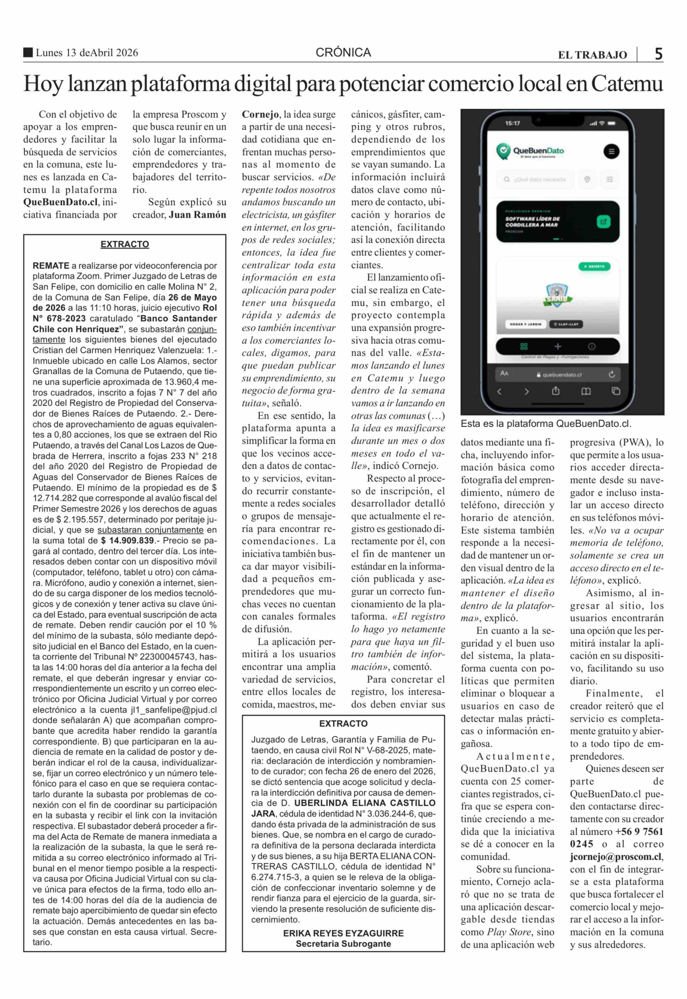 Hoy lanzan plataforma digital para potenciar comercio local en Catemu 13-04-2026 El Trabajo |