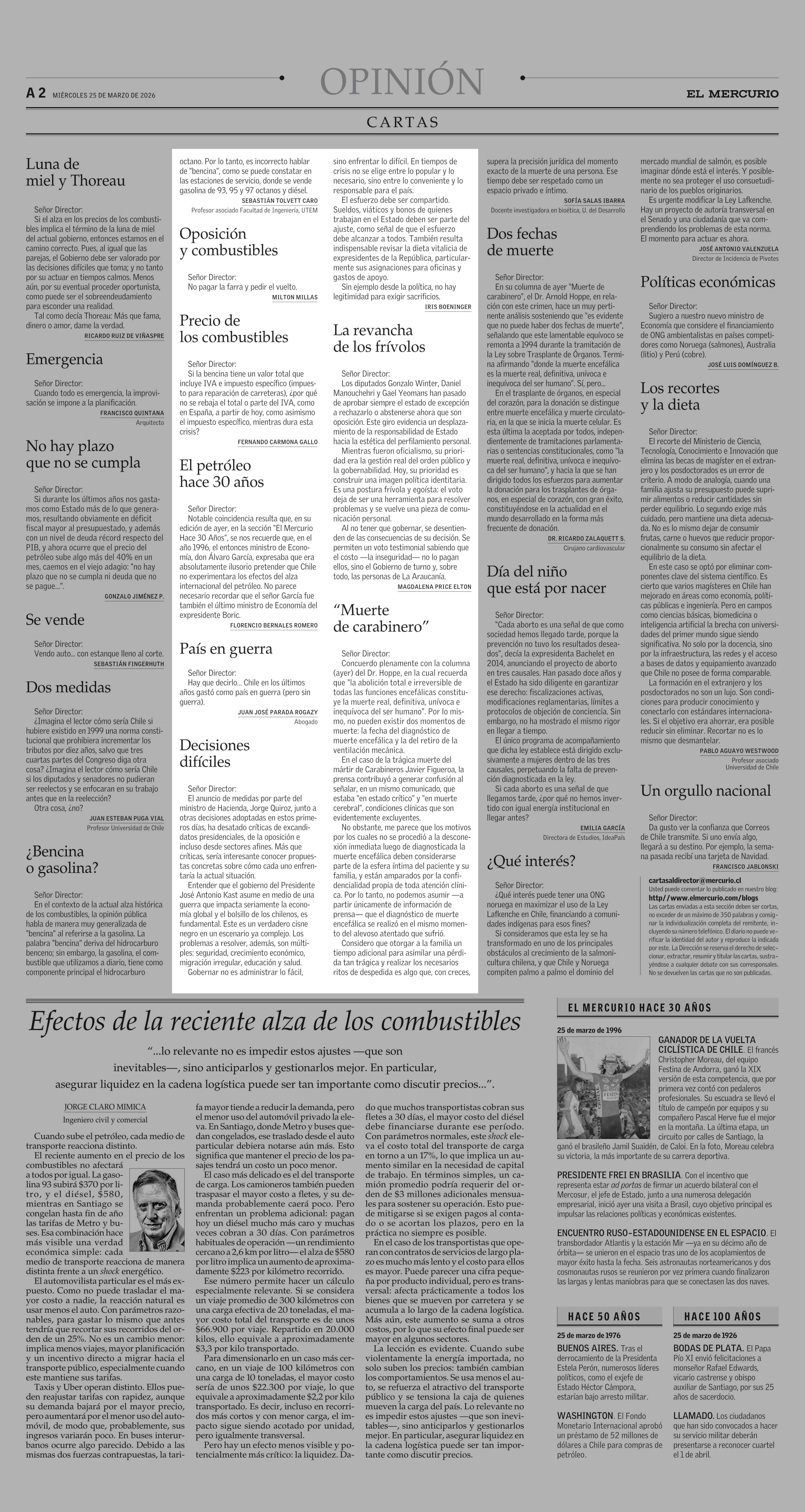 Cartas: Decisiones difíciles 25-03-2026 El Mercurio |