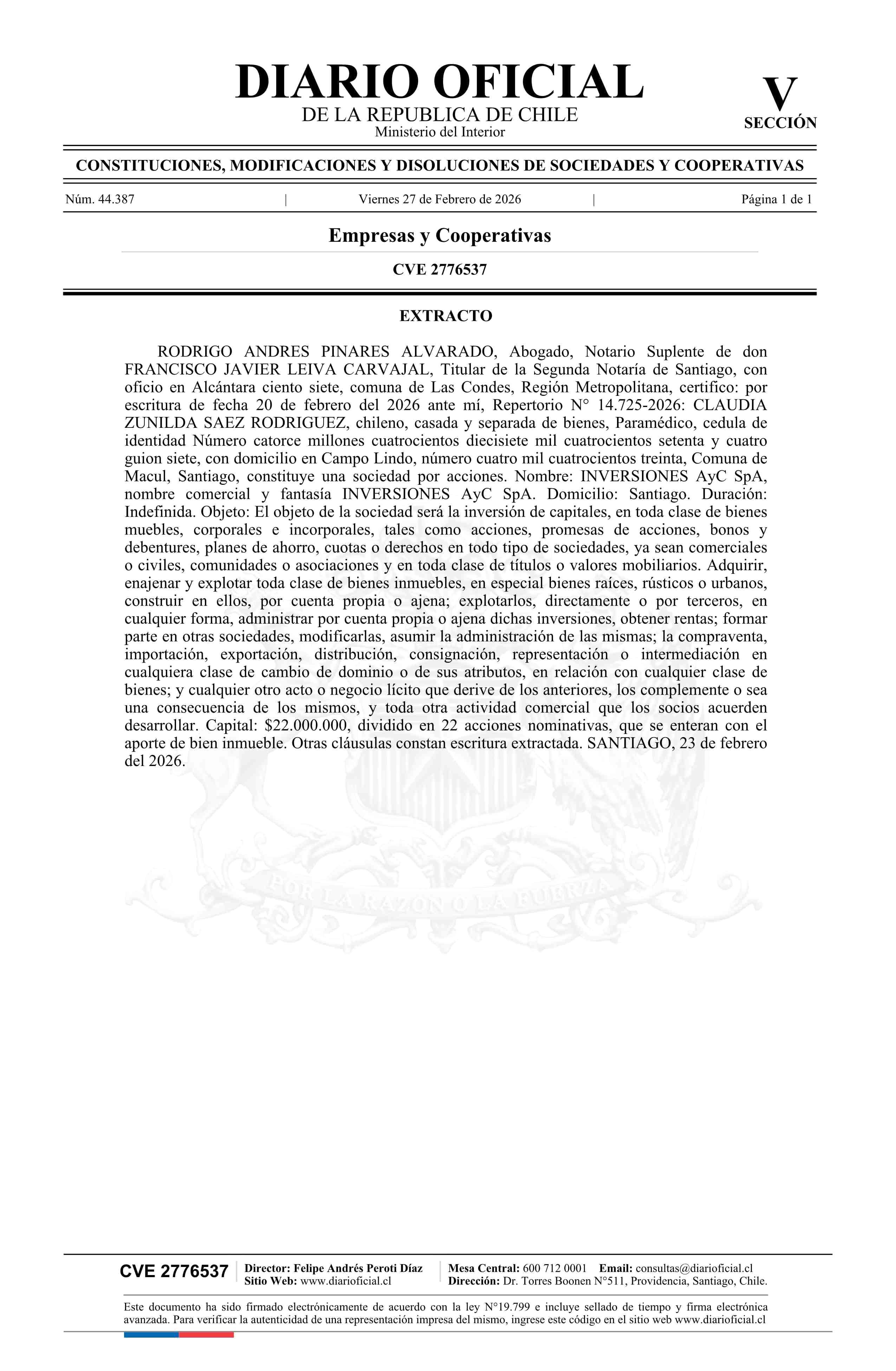 INVERSIONES AyC SpA 27-02-2026 Diario Oficial Edición Electrónica |