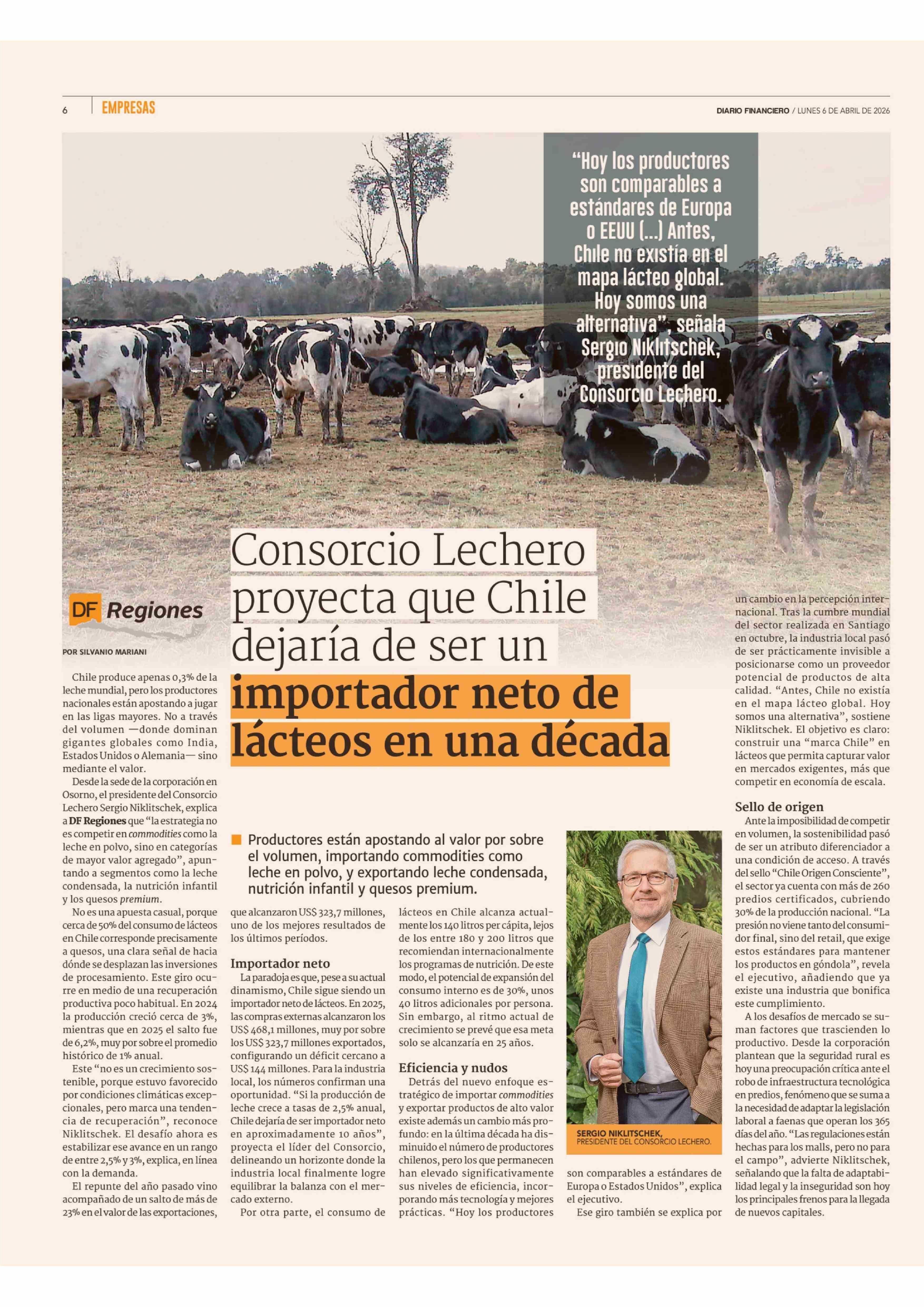 Consorcio Lechero proyecta que Chile dejaría de ser un importador neto de lácteos en una década 06-04-2026 Diario Financiero |