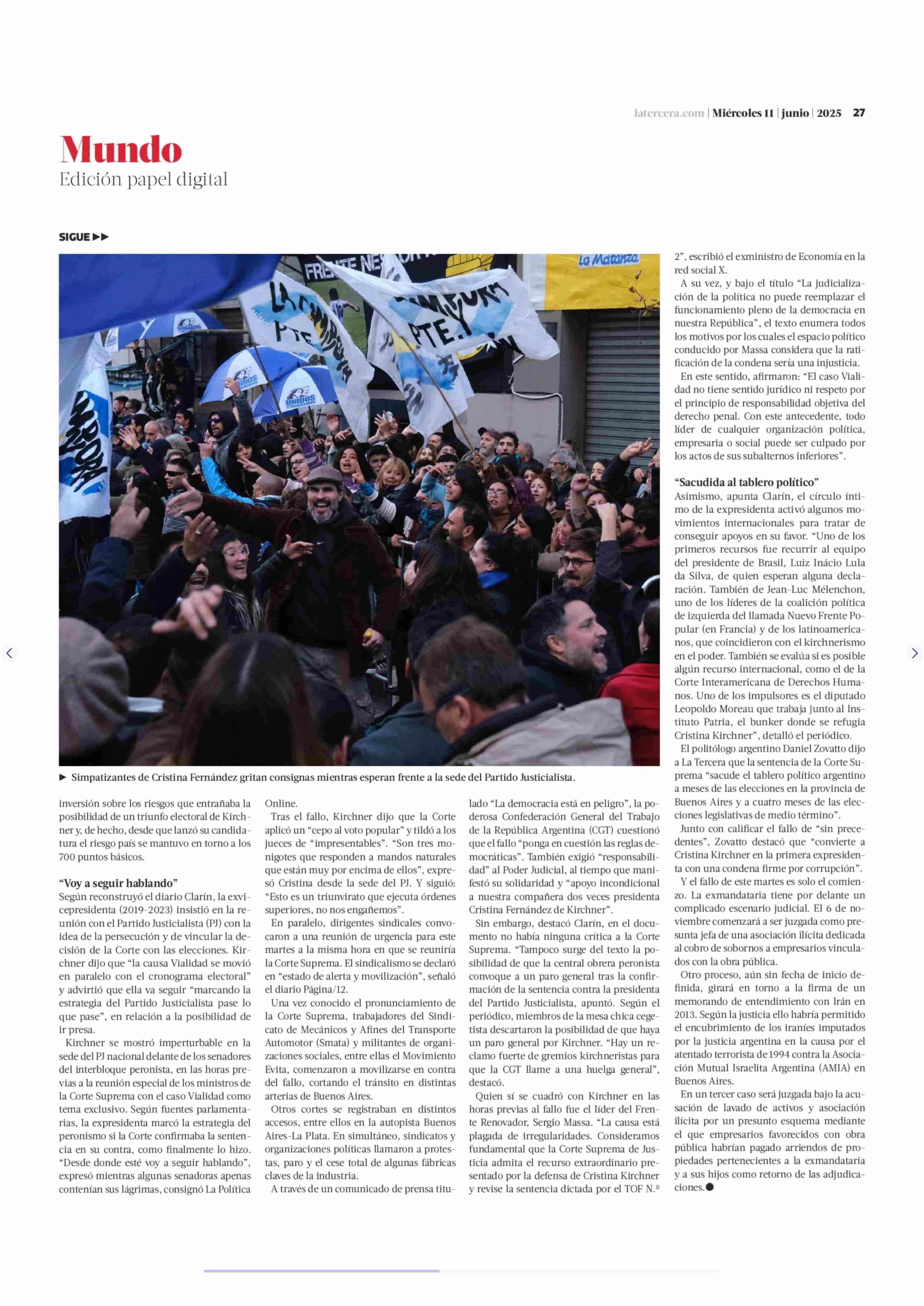 Corte Suprema de Argentina confirma la condena contra Cristina K y no podrá ser candidata a legisladora 11-06-2025 La Tercera |