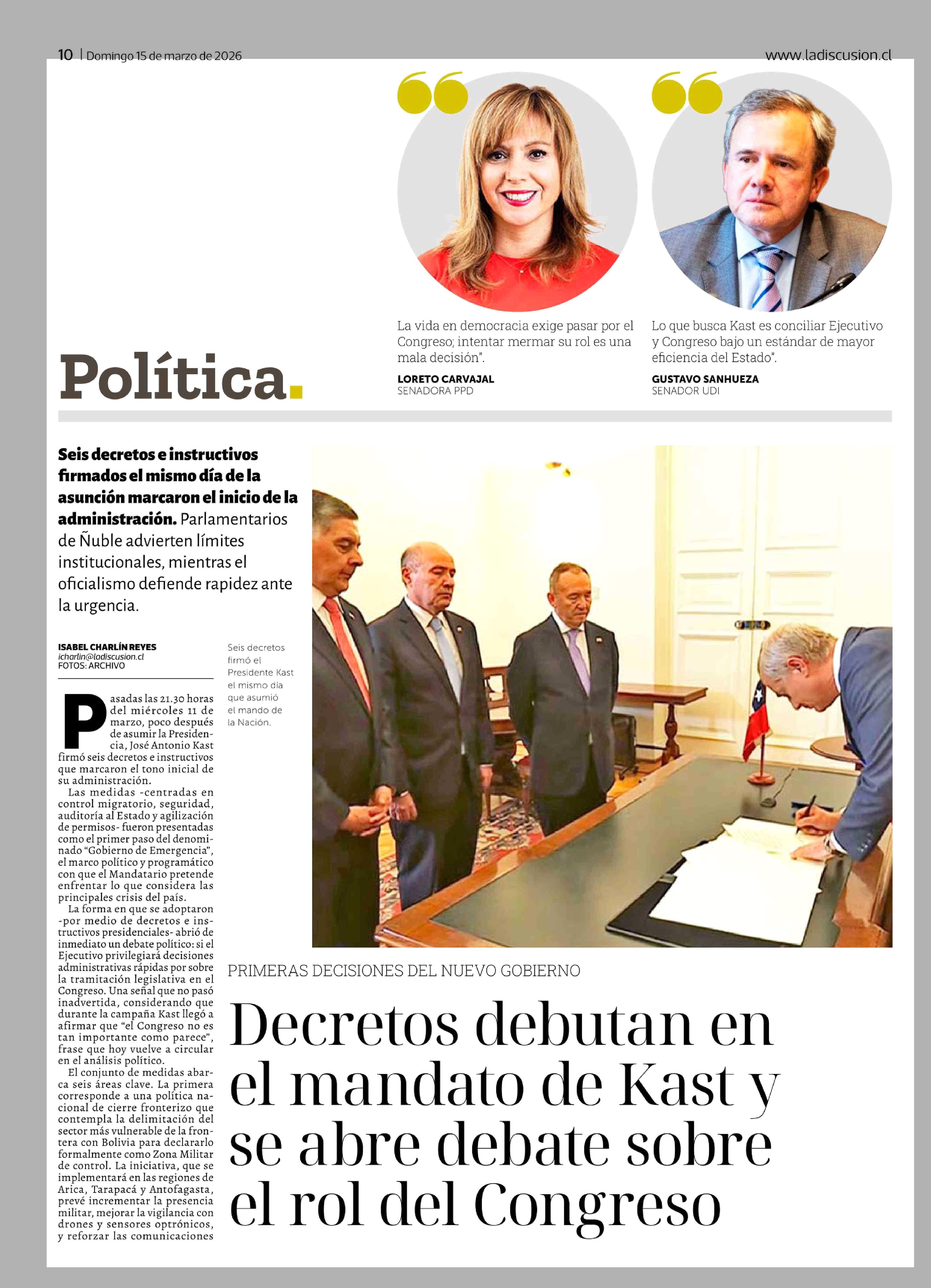 Decretos debutan en el mandato de Kast y se abre debate sobre el rol del Congreso 15-03-2026 La Discusión |