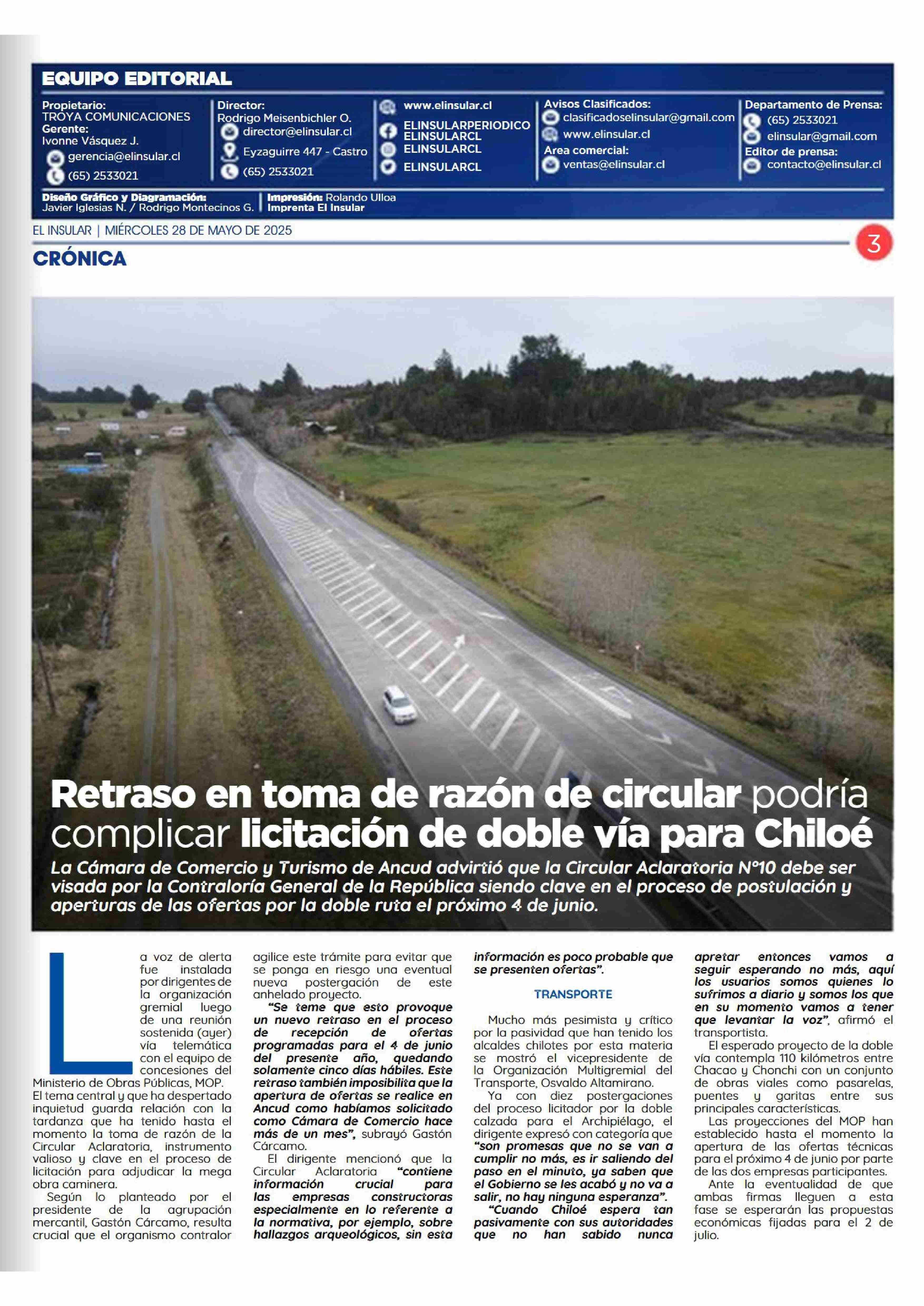 Retraso en toma de razón dé circular podría comphcar licitación de doble vía para Chiloé 28-05-2025 El Insular |