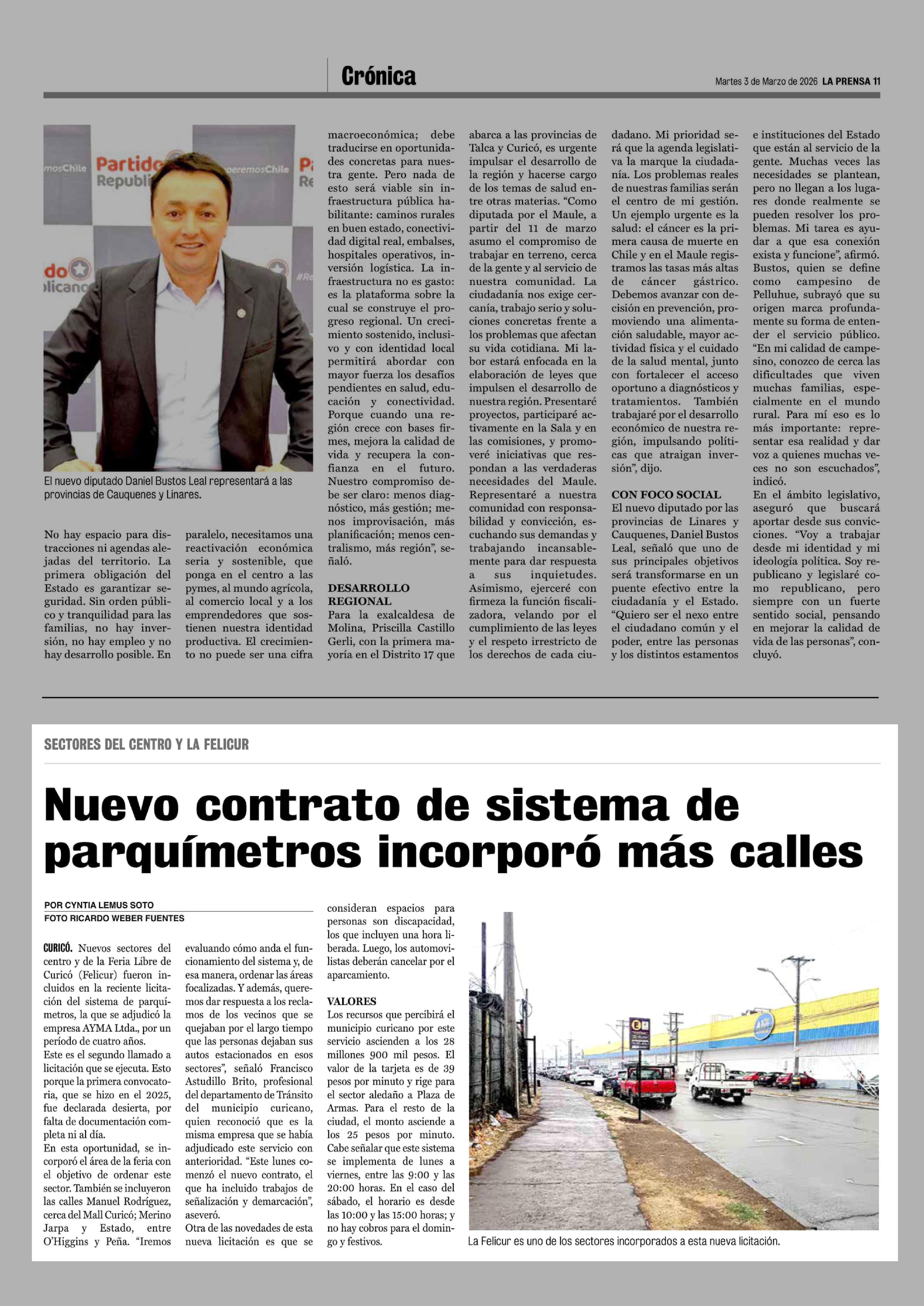Nuevo contrato de sistema de parquímetros incorporó más calles 03-03-2026 La Prensa de Curicó |