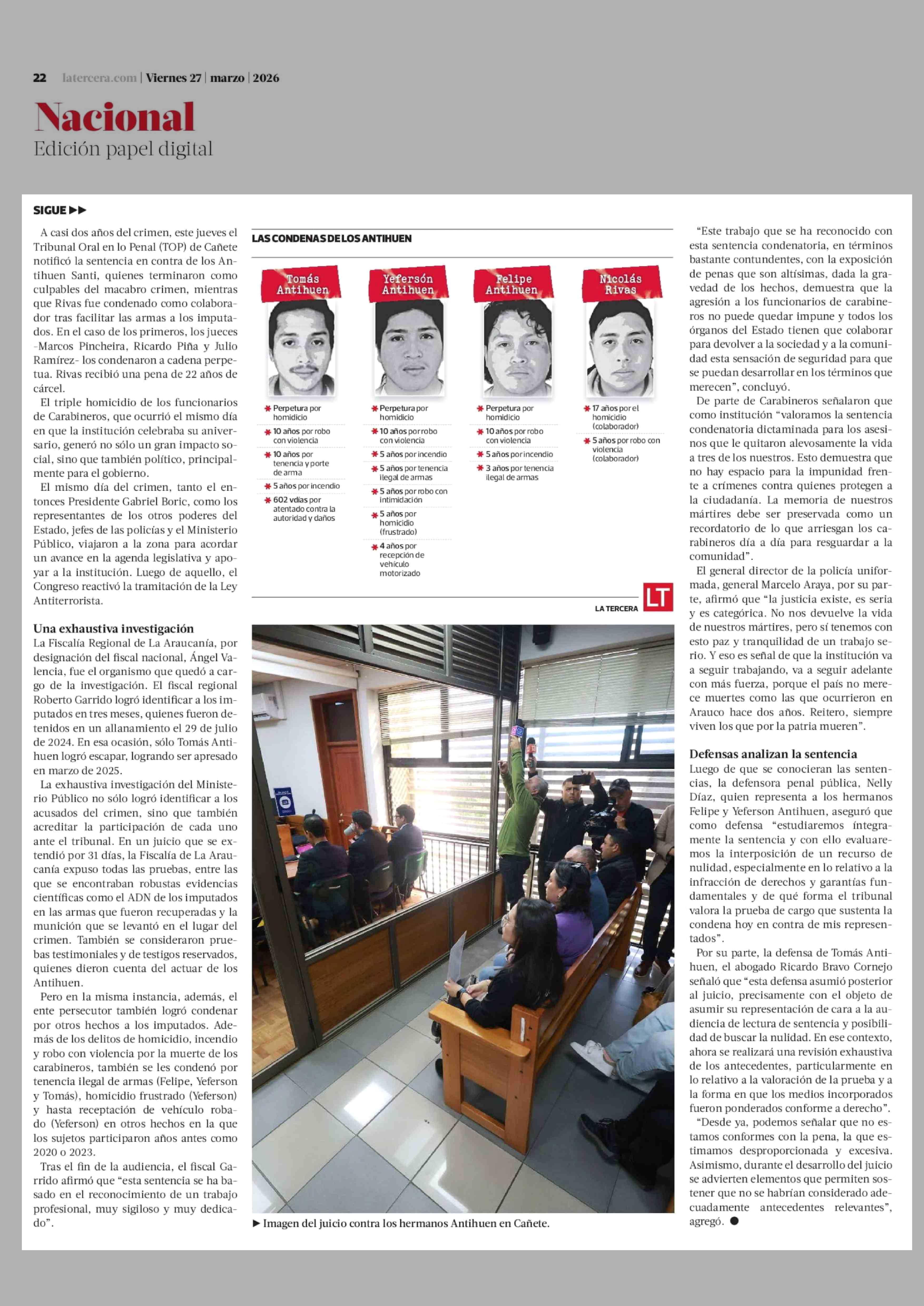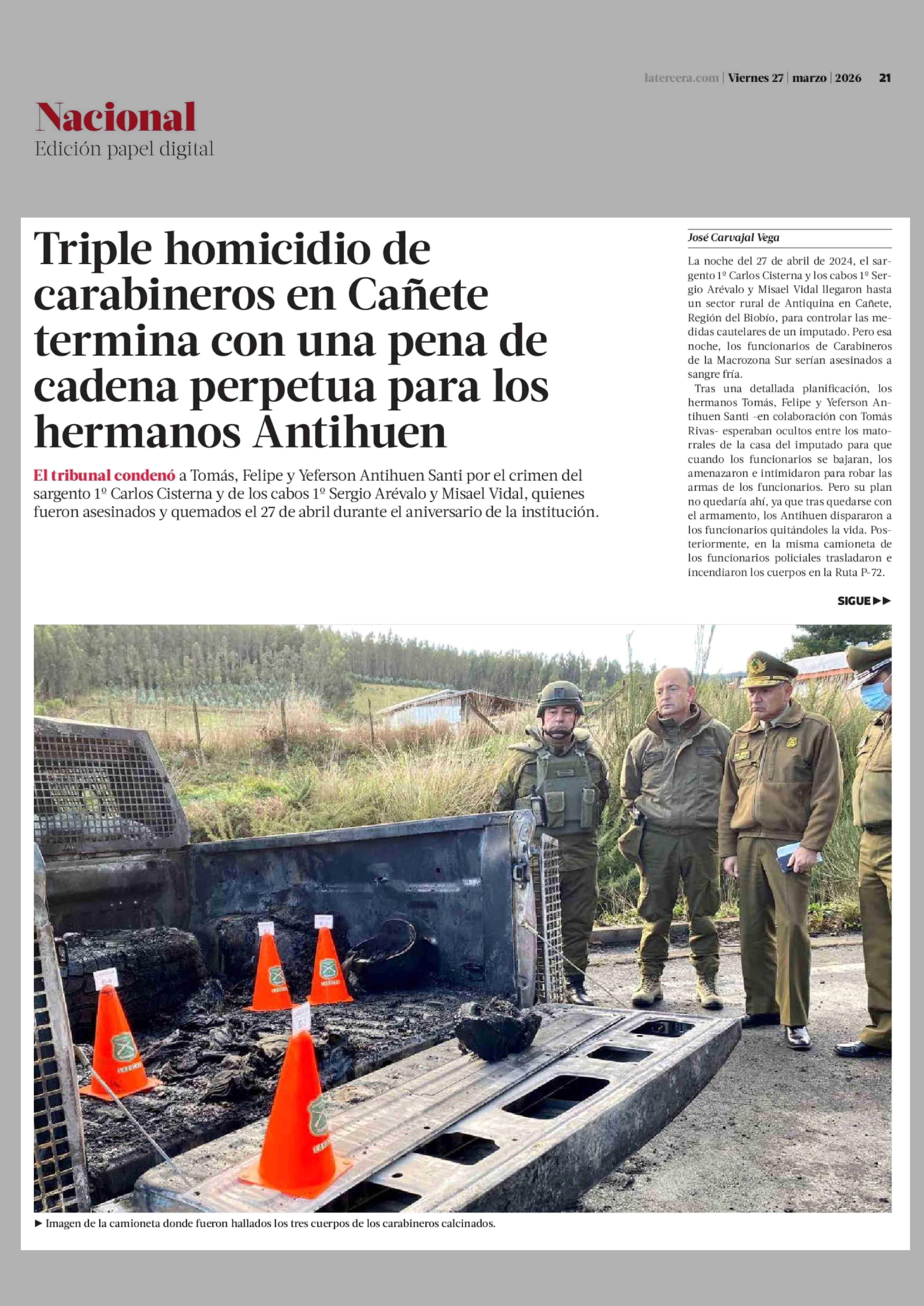 Triple homicidio de carabineros en Cañete termina con una pena de cadena perpetua para los hermanos Antihuen 27-03-2026 La Tercera |