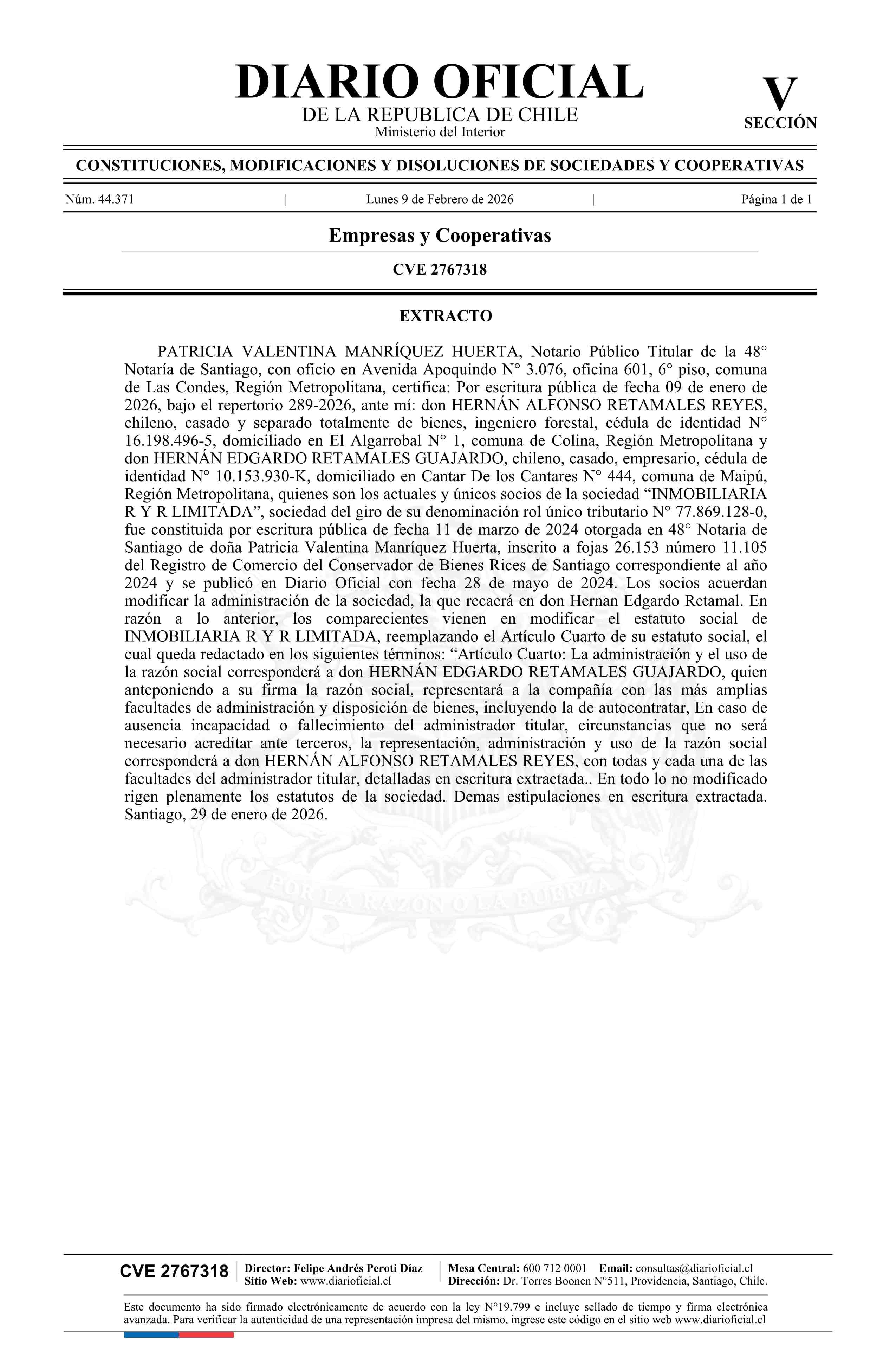 INMOBILIARIA R Y R LIMITADA 77.869.128-0* 09-02-2026 Diario Oficial Edición Electrónica |