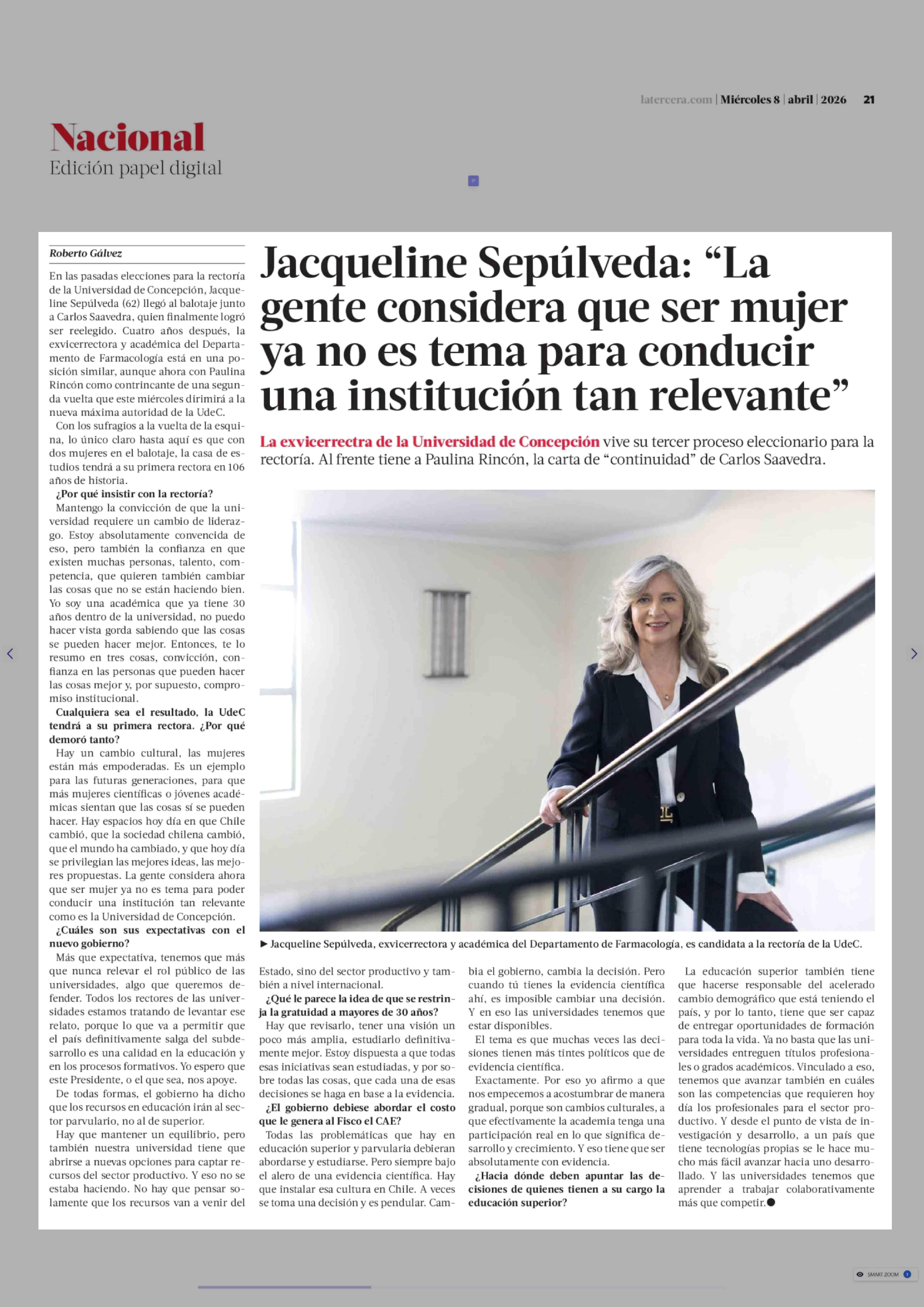 Jacqueline Sepúlveda: "La gente considera que ser mujer ya no es tema para conducir una institución tan relevante" 08-04-2026 La Tercera |