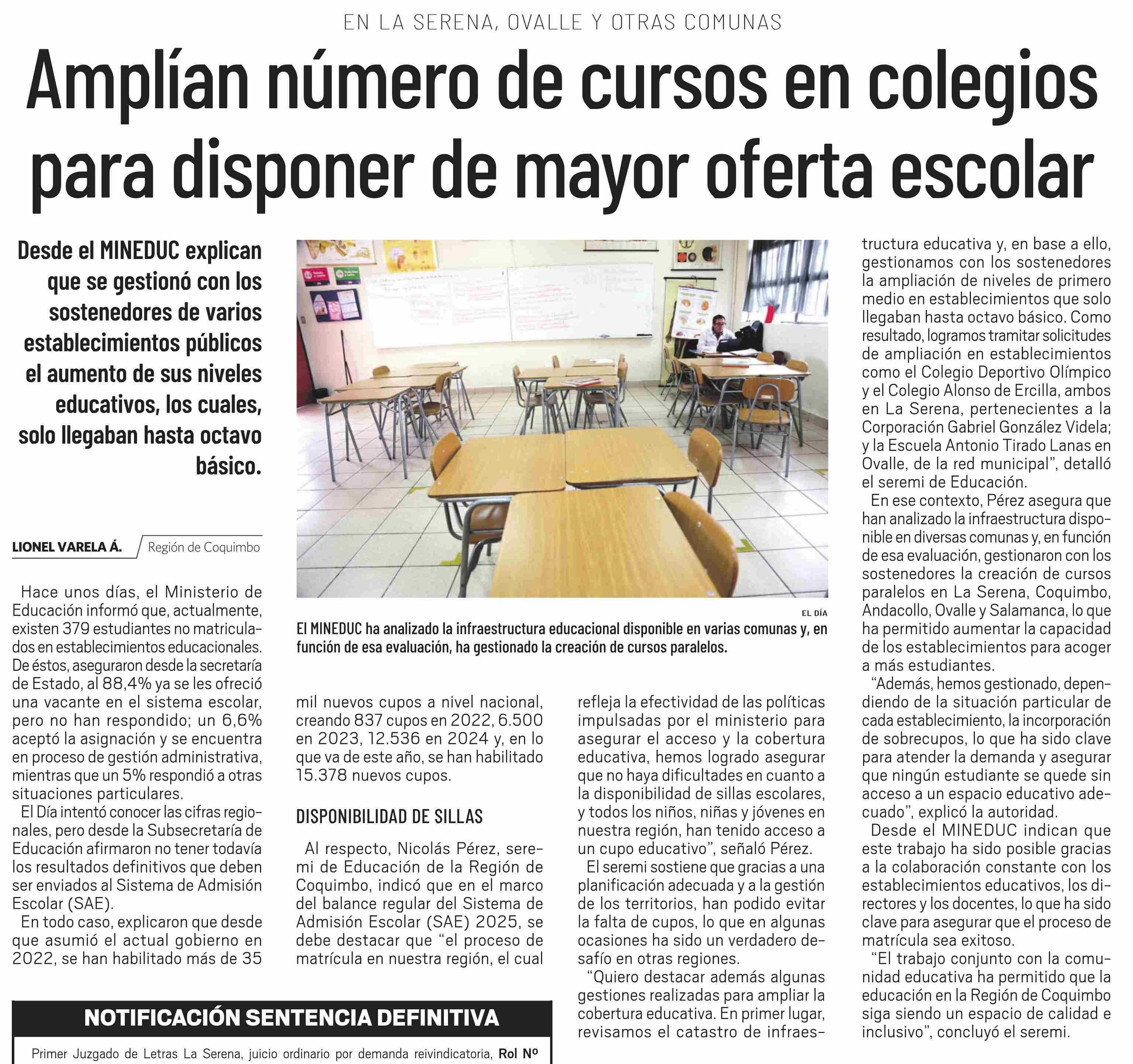 Amplían número de cursos en colegios para disponer de mayor oferta escolar 09-04-2025 El Día |