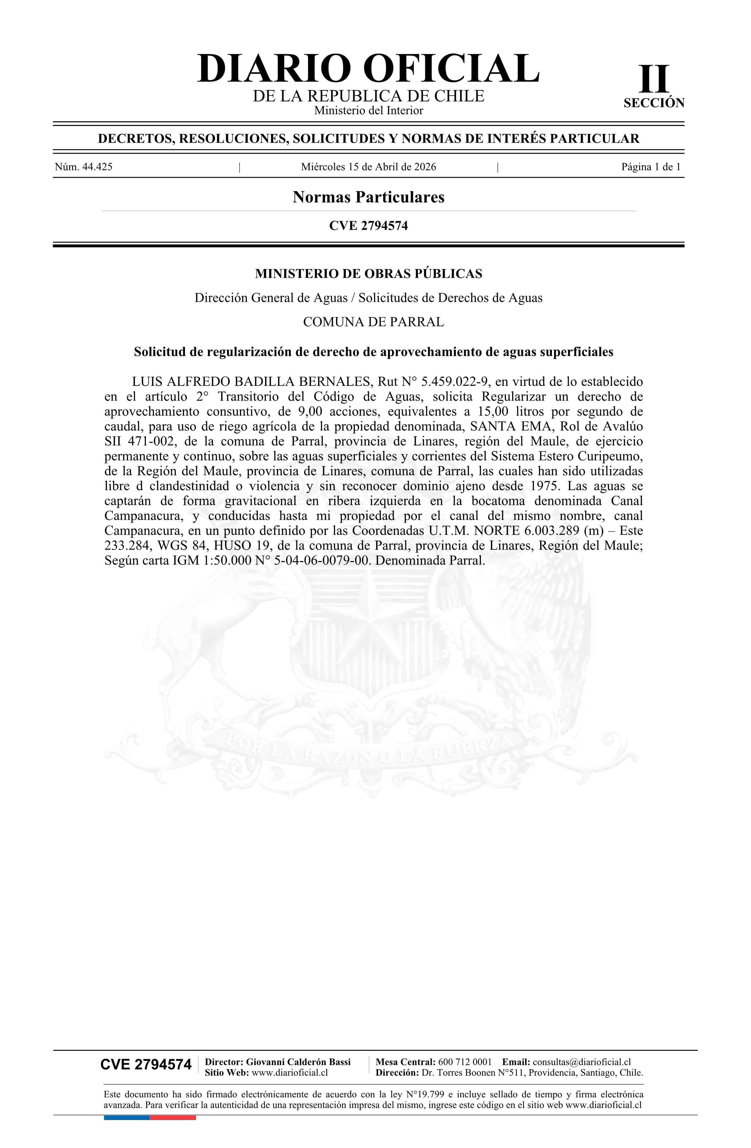 Fuente: Diario Oficial Edición Electrónica (Diario Oficial de Chile - 2 Normas Particulares) Página(s): 281