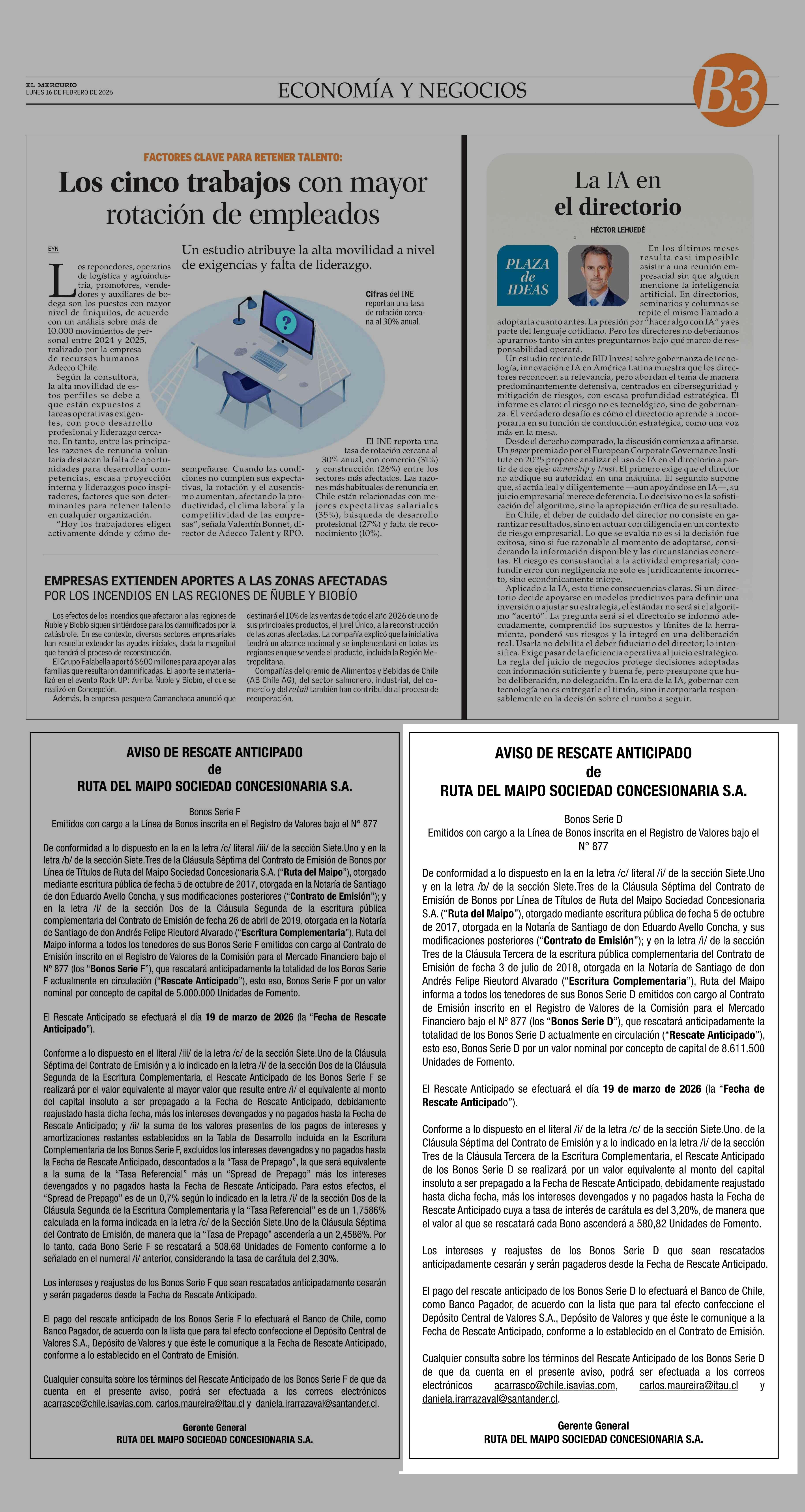 EXTRACTOS: AVISO DE RESCATE ANTICIPADO de RUTA DEL MAIPO SOCIEDAD CONCESIONARIA S.A. 16-02-2026 El Mercurio |