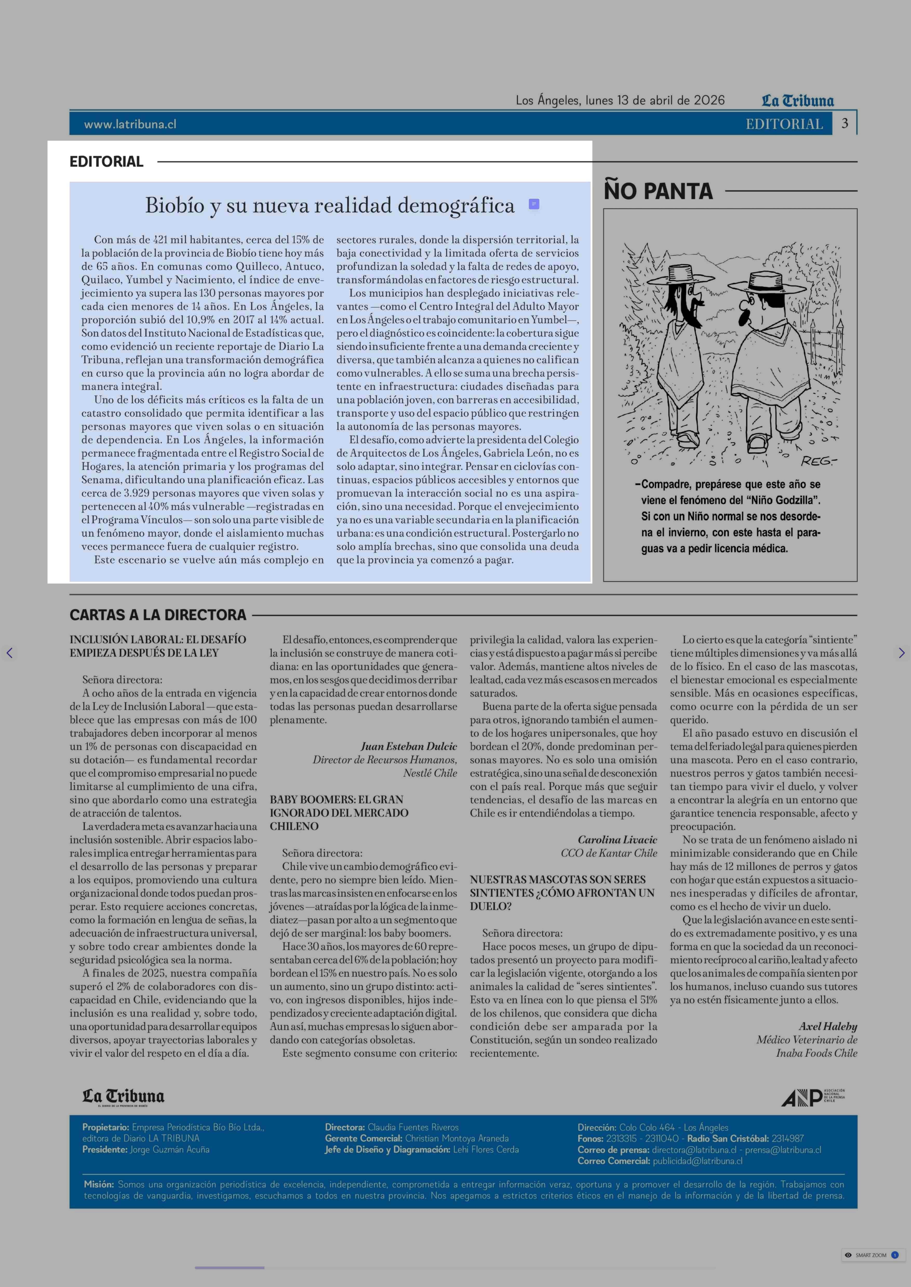 EDITORIAL: Biobío y su nueva realidad demográfica 13-04-2026 La Tribuna |