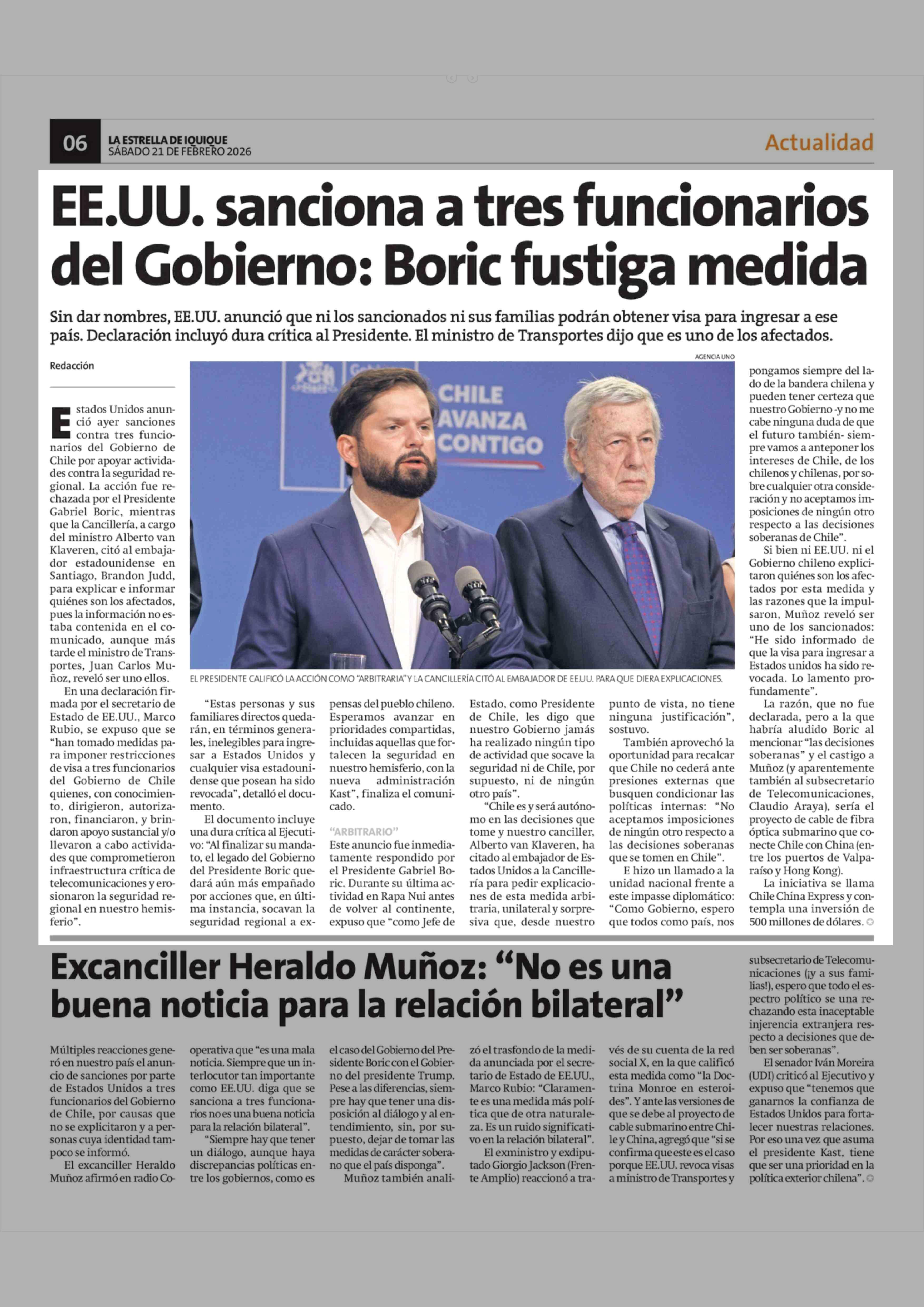 EE.UU. sanciona a tres funcionarios del Gobierno: Boric fustiga medida 21-02-2026 La Estrella de Iquique |