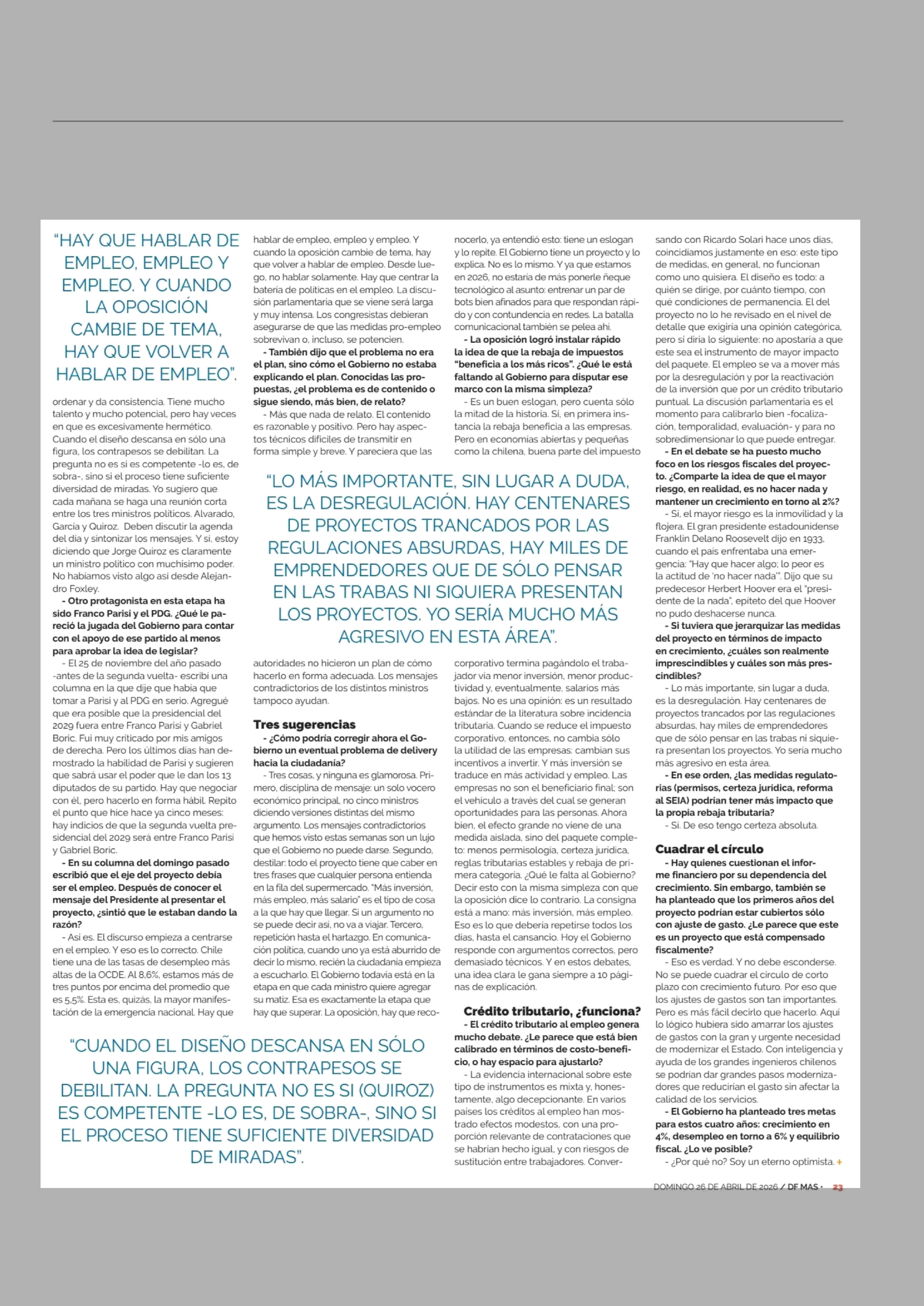 SEBASTIÁN EDWARDS: "JORGE QUIROZ ES CLARAMENTE UN MINISTRO POLÍTICO CON MUCHÍSIMO PODER. NO HABÍAMOS VISTO ALGO ASÍ DESDE ALEJANDRO FOXLEY" 26-04-2026 Diario Financiero |