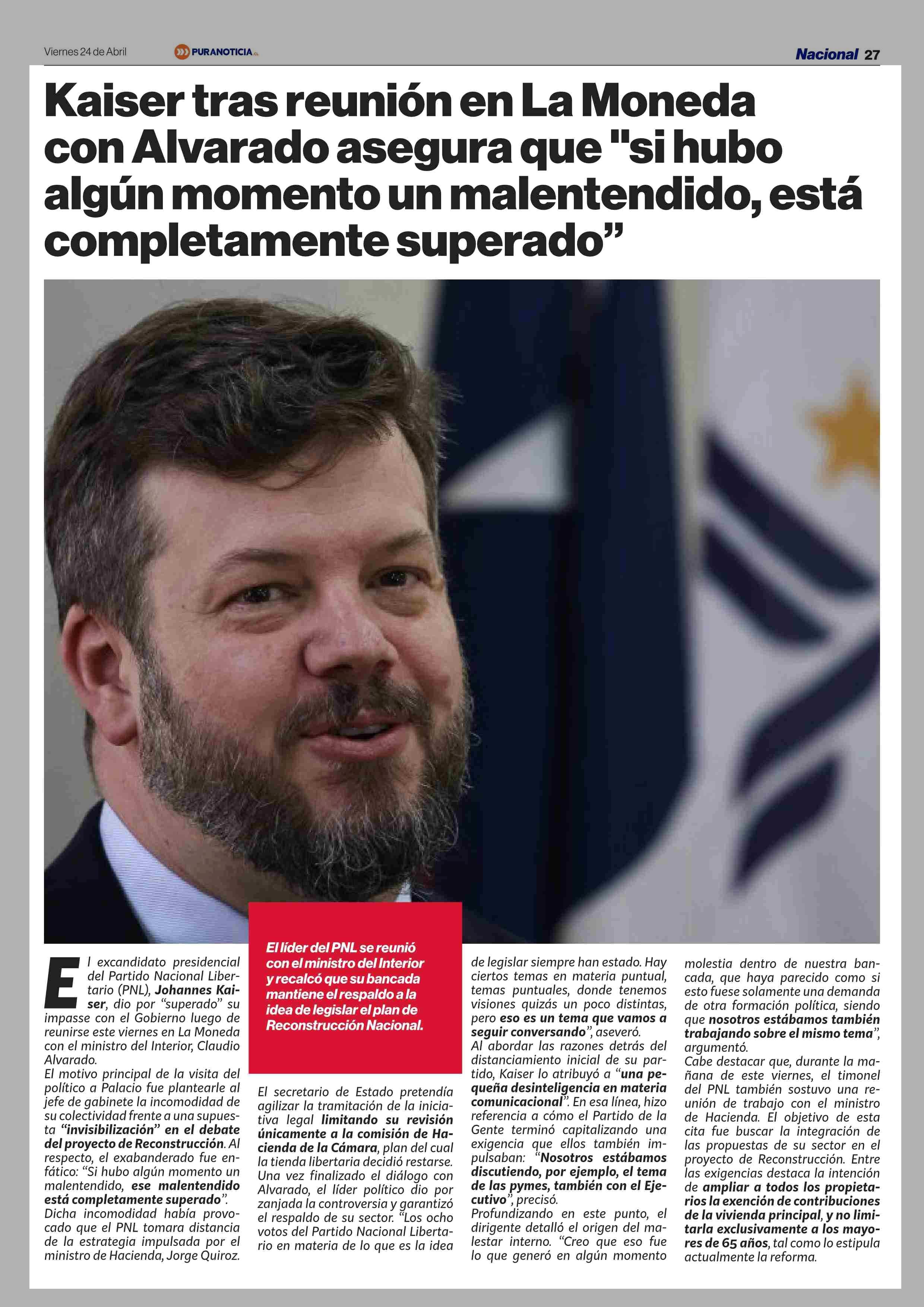 Kaiser tras reunión en La Moneda con Alvarado asegura que "si hubo algún momento un malentendido, está completamente superado" 24-04-2026 Puranoticia.cl |