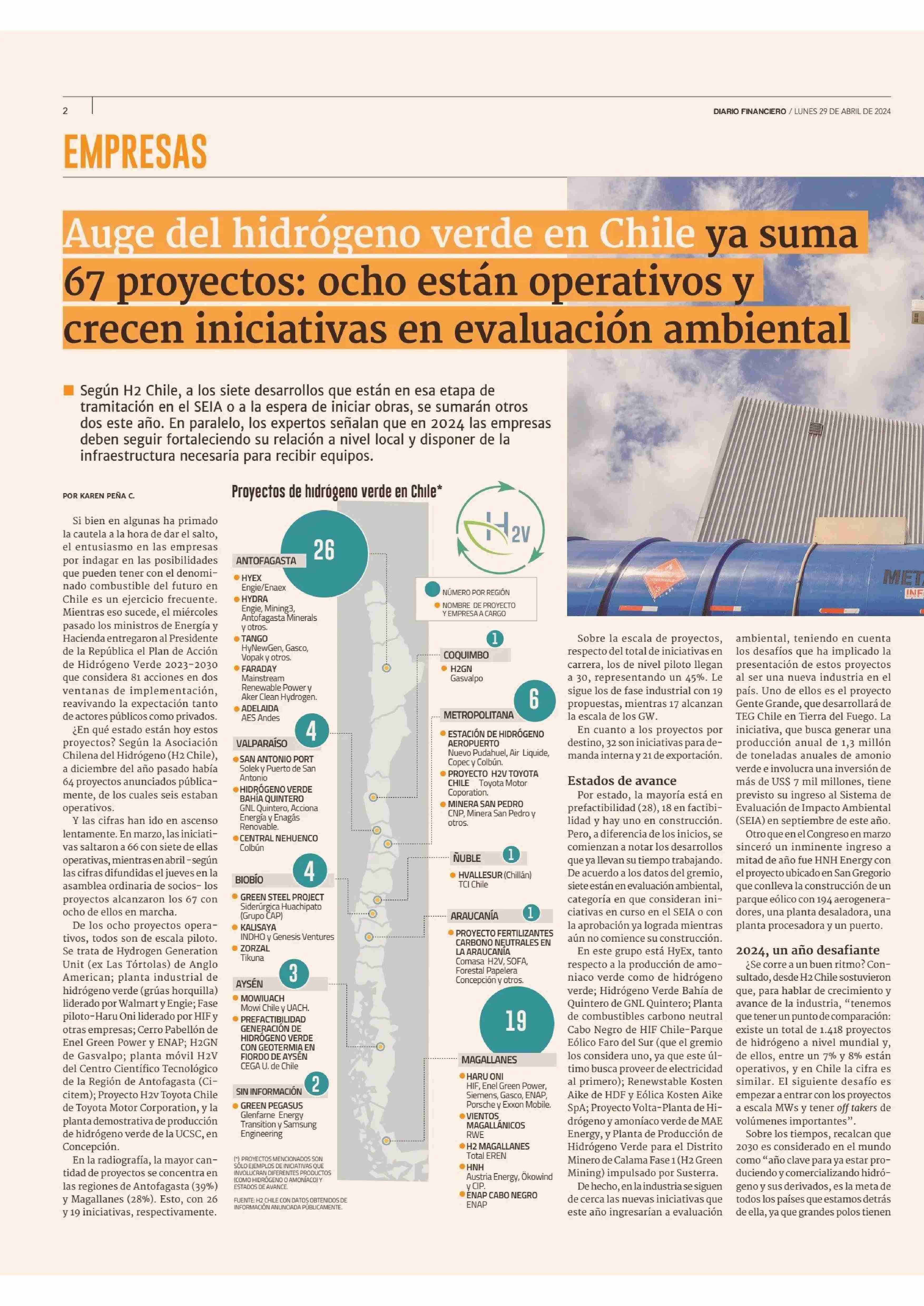 Auge del hidrógeno verde en Chile Auge ya suma 67 proyectos: ocho están operativos y crecen iniciativas en evaluación ambiental 29-04-2024 Diario Financiero |