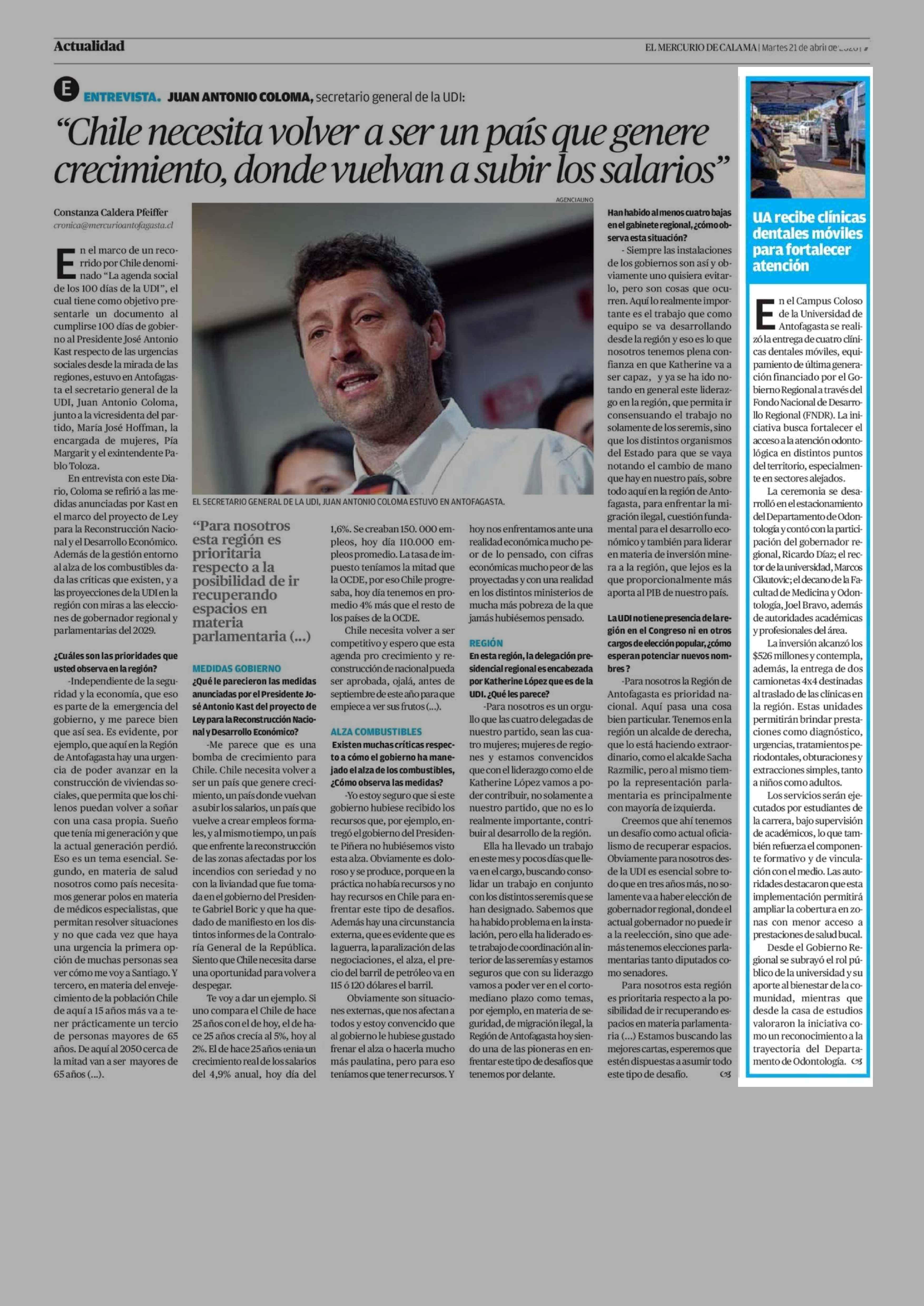 UA recibe clínicas dentales móviles para fortalecer atención 21-04-2026 El Mercurio de Calama |