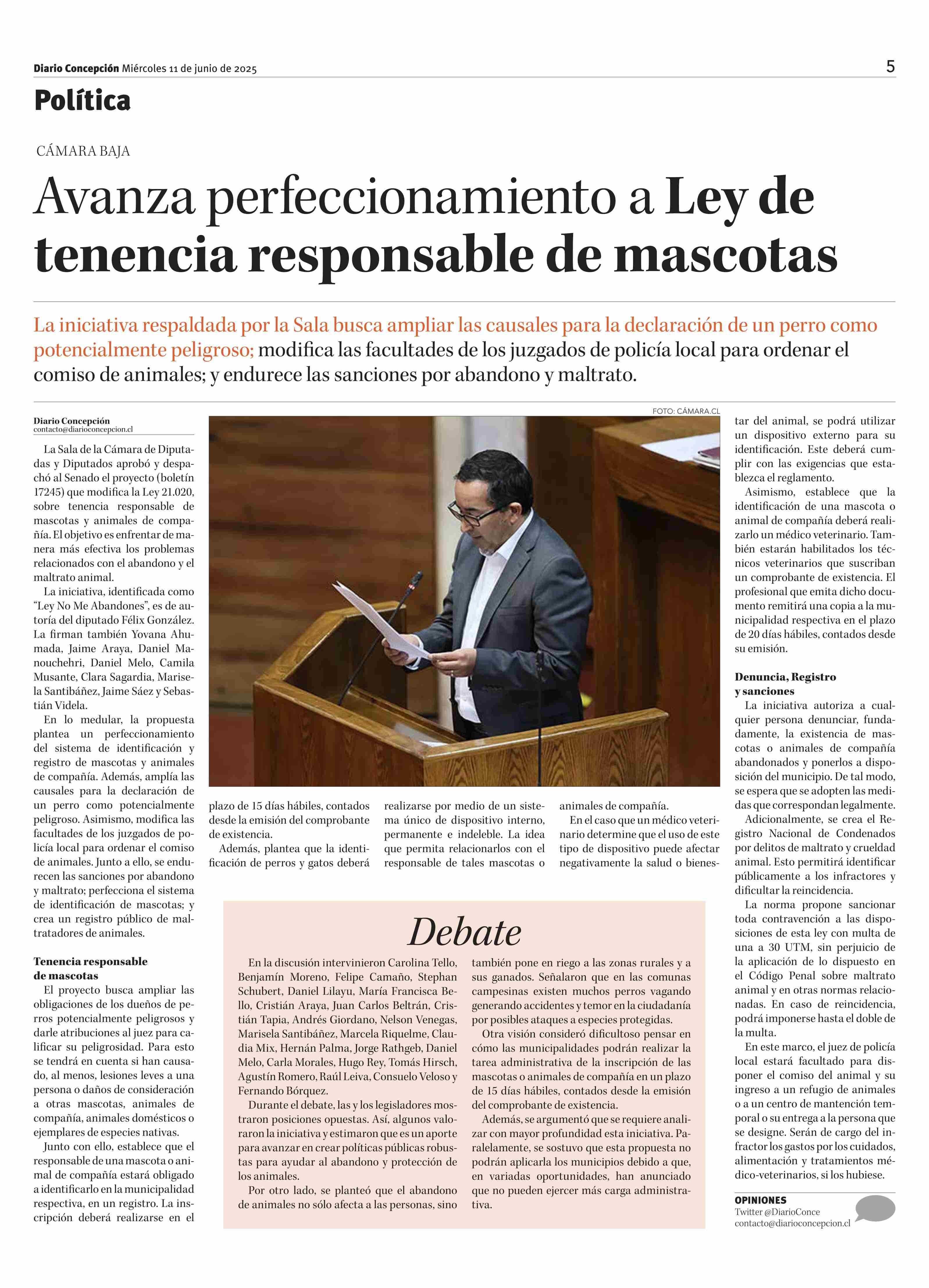 Avanza perfeccionamiento a Ley de tenencia responsable de mascotas 11-06-2025 Diario Concepción |