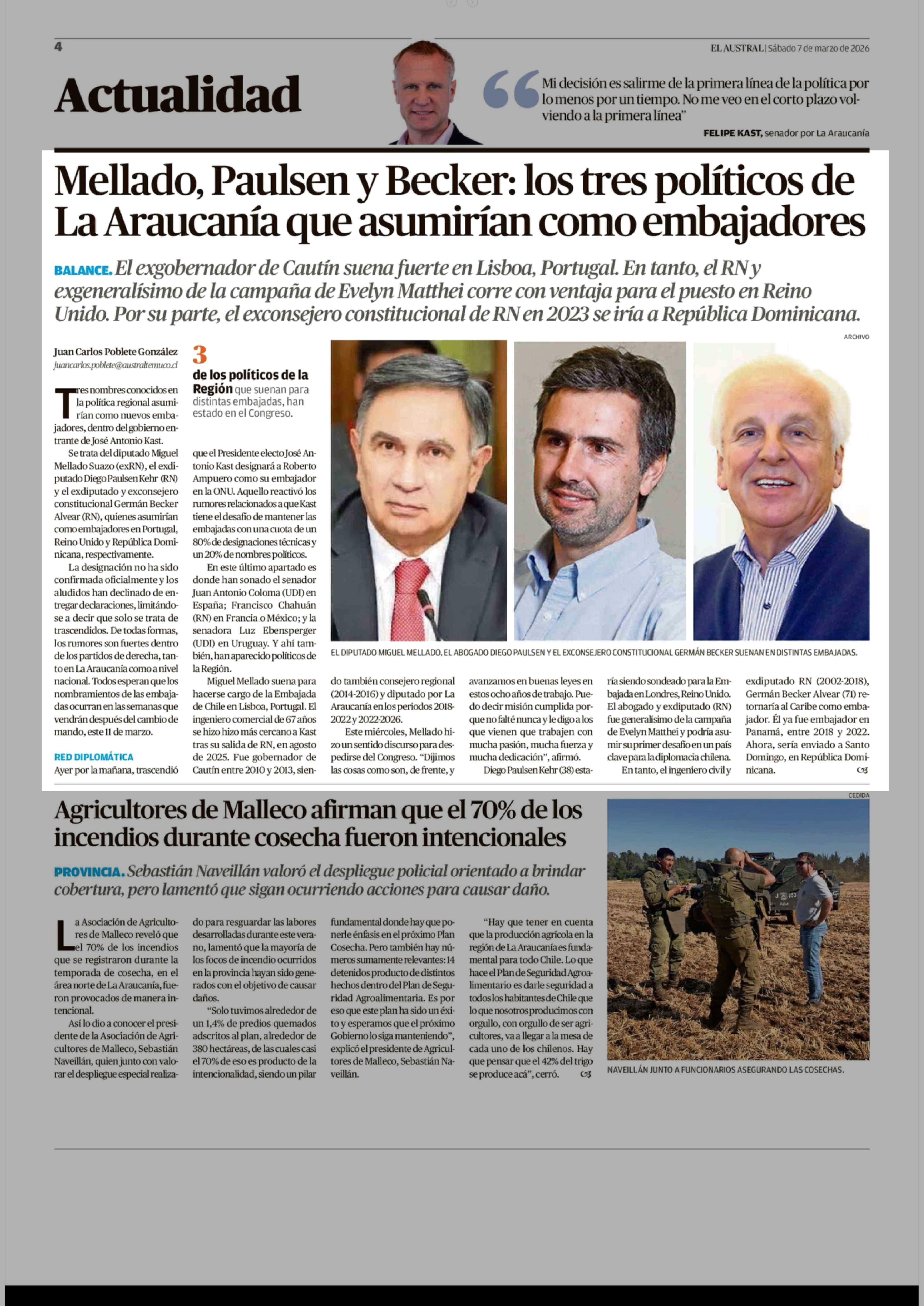 Mellado, Paulsen y Becker: los tres políticos de La Araucanía que asumirían como embajadores 07-03-2026 El Austral de la Araucanía |