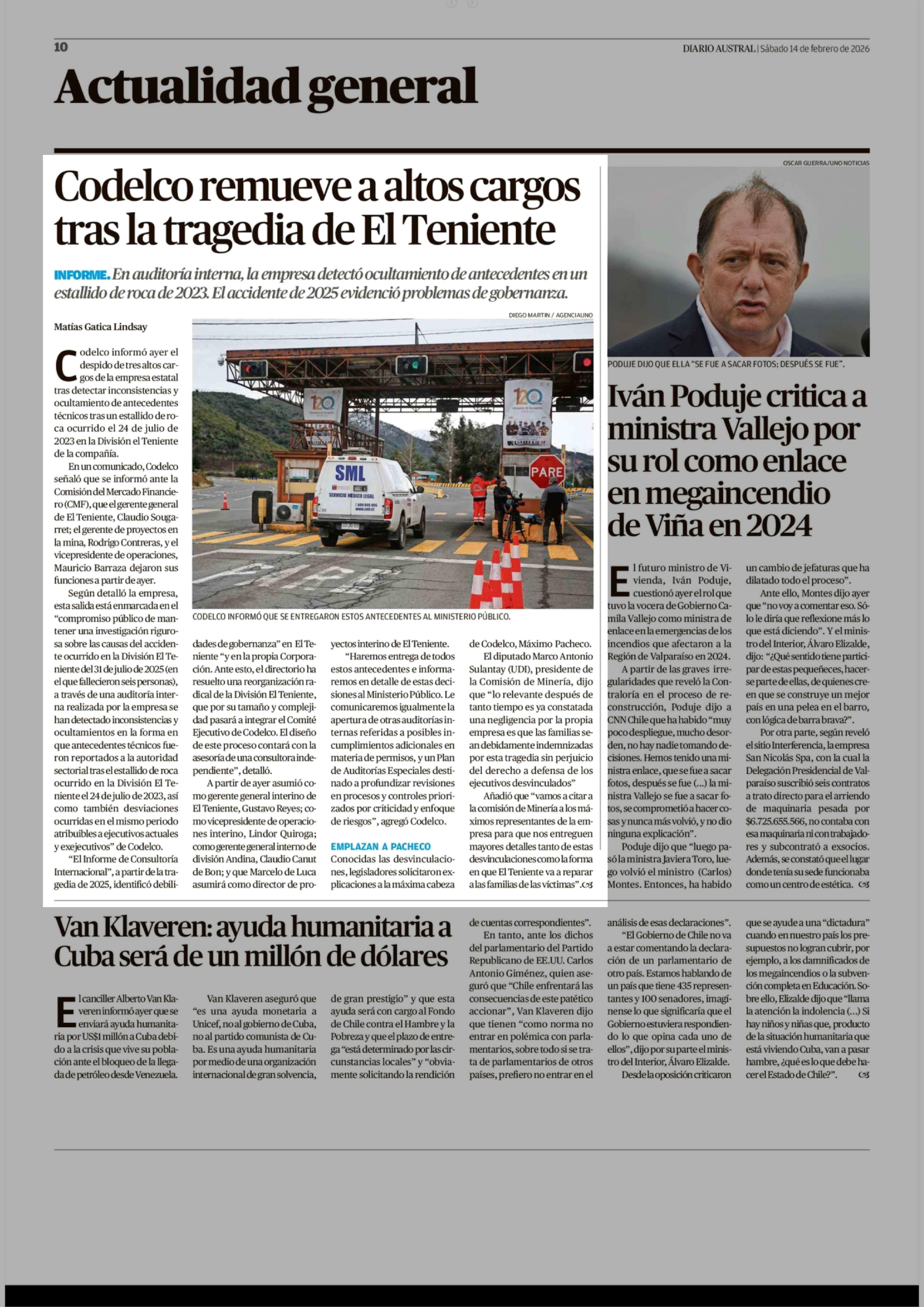 Codelco remueve a altos cargos tras la tragedia de El Teniente 14-02-2026 Diario Austral Región de Los Ríos |