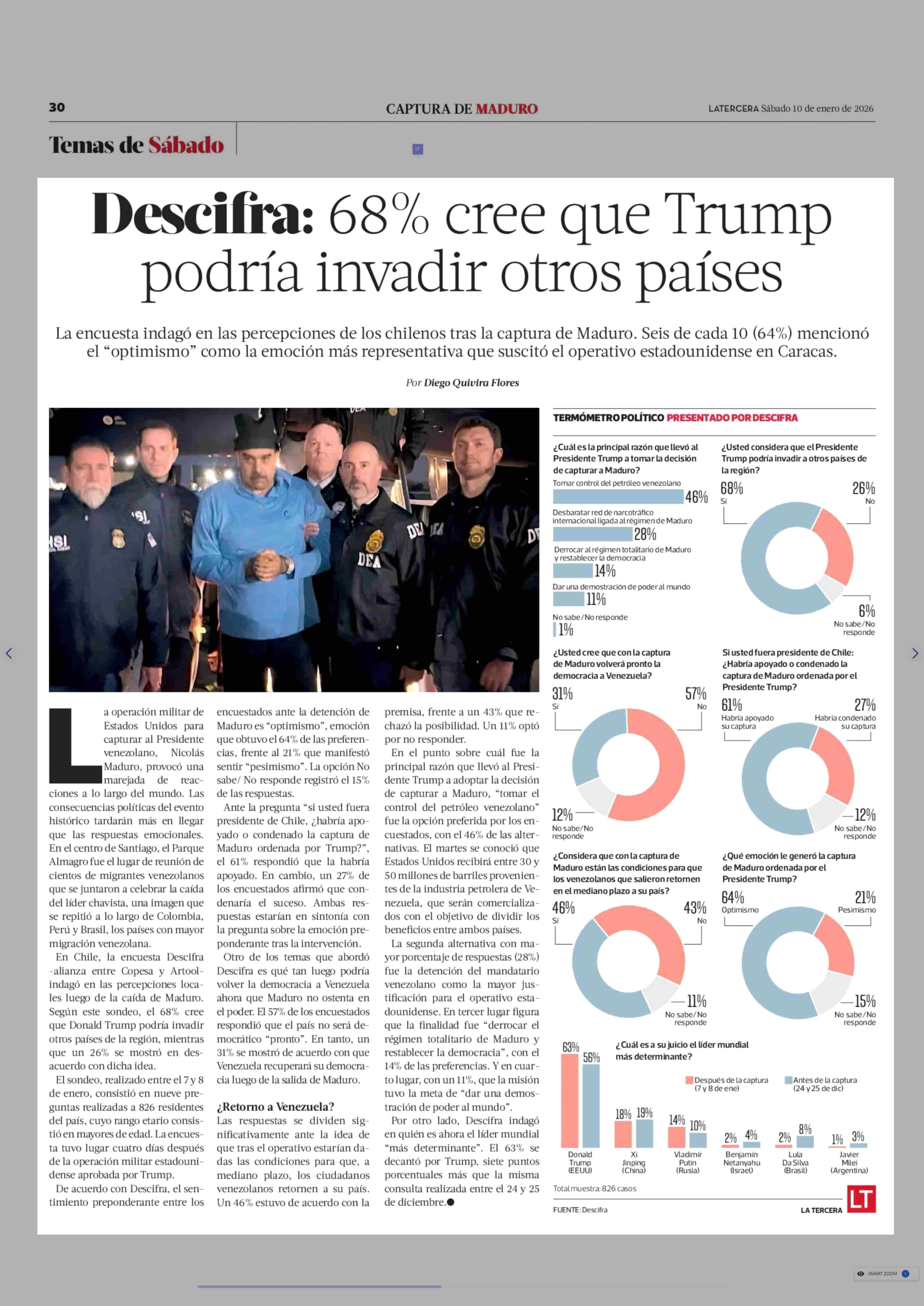 Descifra: 68% cree que Trump podría invadir otros países 10-01-2026 La Tercera |