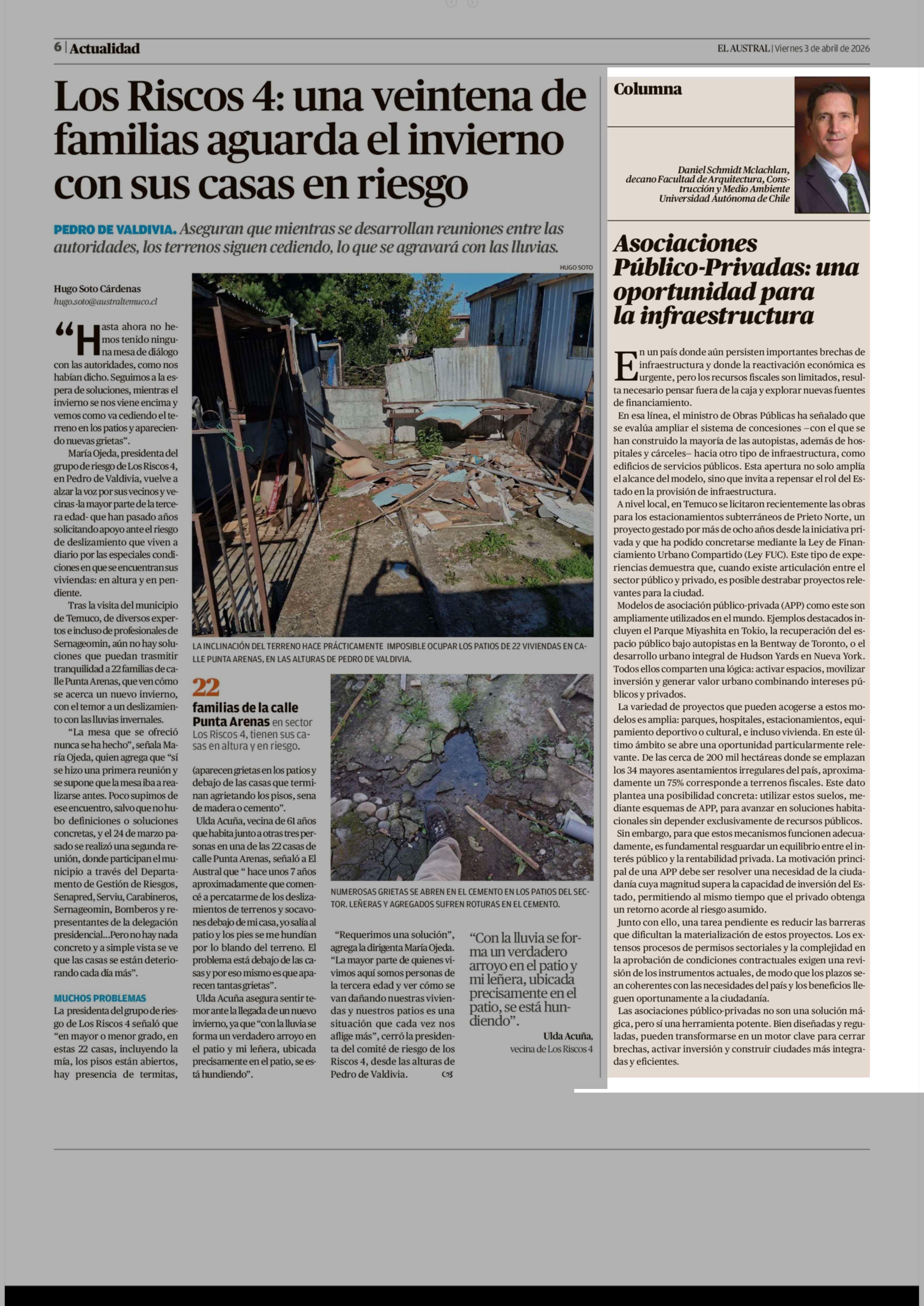 COLUMNAS DE OPINIÓN: Asociaciones Público -Privadas: una oportunidad para la infraestructura 03-04-2026 El Austral de la Araucanía |