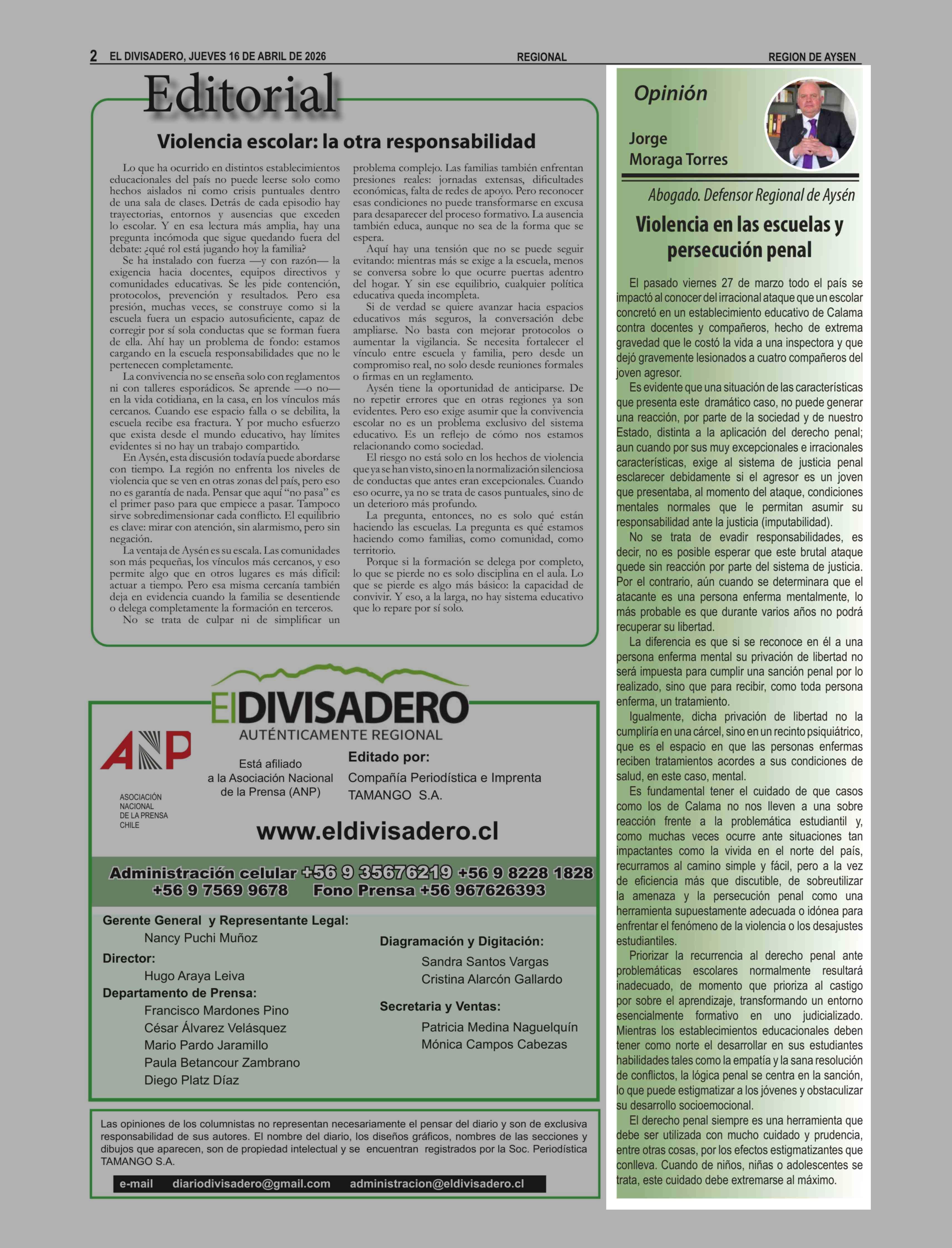Columnas de Opinión: Violencia en las escuelas y persecución penal 16-04-2026 El Divisadero |