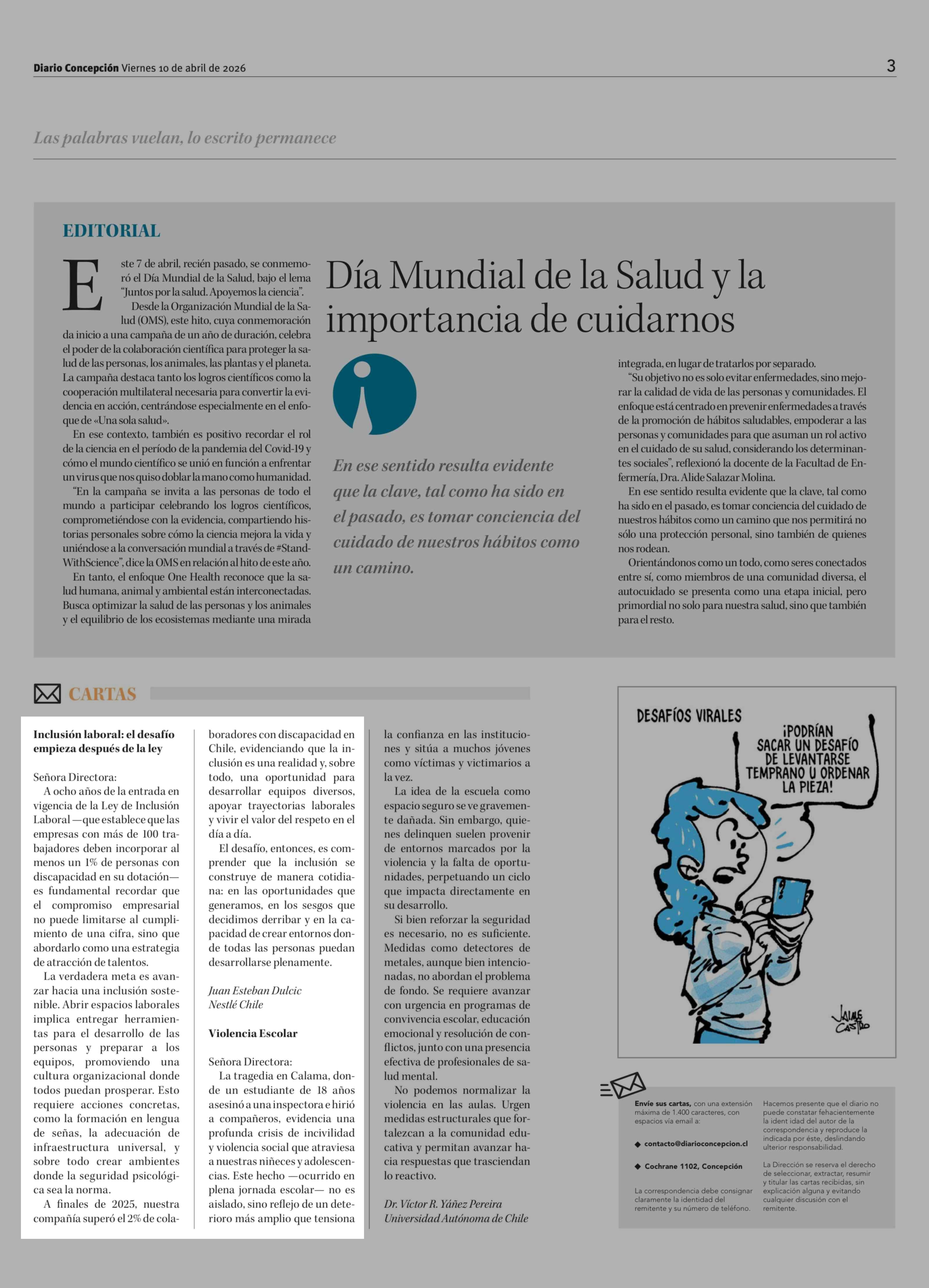 Cartas: Inclusión laboral, el desafío empieza después de la ley 10-04-2026 Diario Concepción |